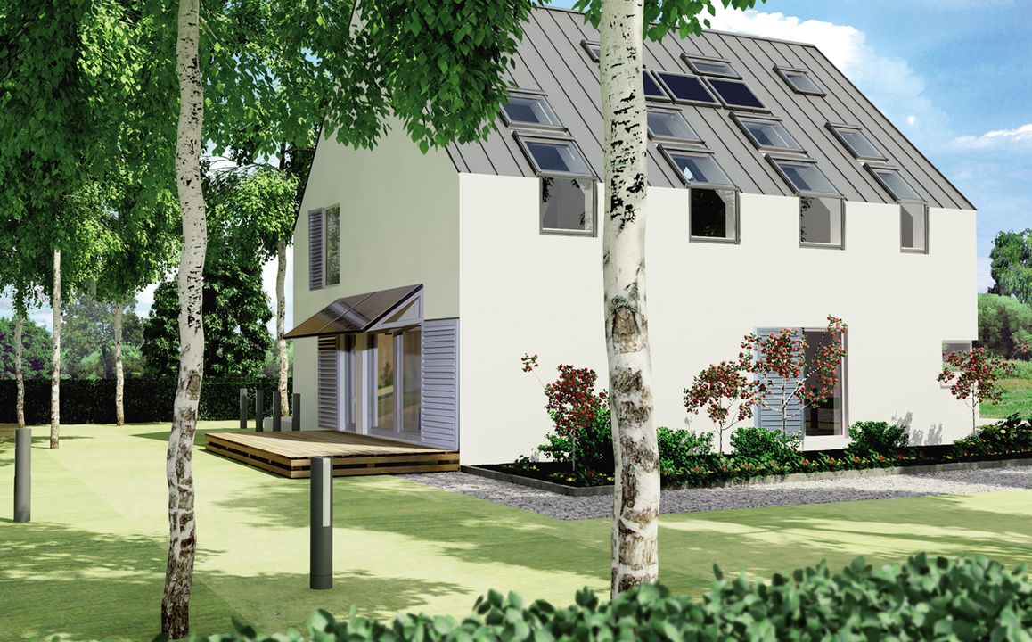 Ściany zewnętrzne: murowane, dwuwarstowe. Strop: systemowy Ytong. Dach: konstrukcja drewniana z belek dwuteowych, kryty blachą. Inne: schody wewnętrzne drewniane. Rozwiązania instalacyjne energooszczędne:. Ogrzewanie: pompa ciepła, rozprowadzenie ciepła: ogrzewanie podłogowe. Wentylacja: wentylacja mechaniczna nawiewno-wywiewna z rekuperacją. Dodatkowo: ogniwa fotowoltaiczne i panele solarne oraz system odzyskiwania wody deszczowej. Elewacje: tynk strukturalny. Stolarka: aluminiowa.