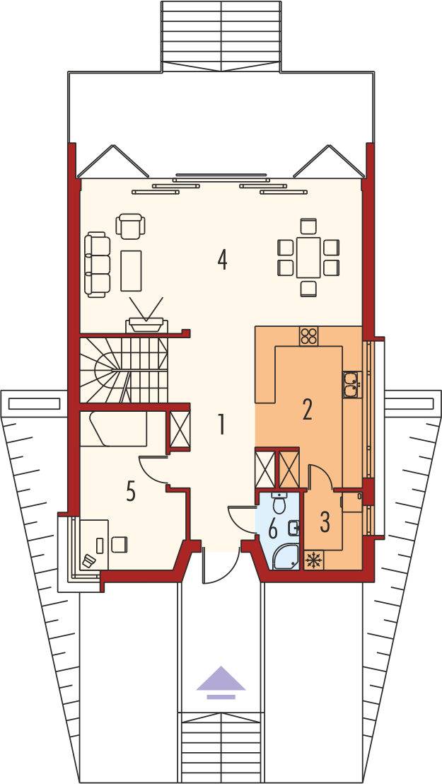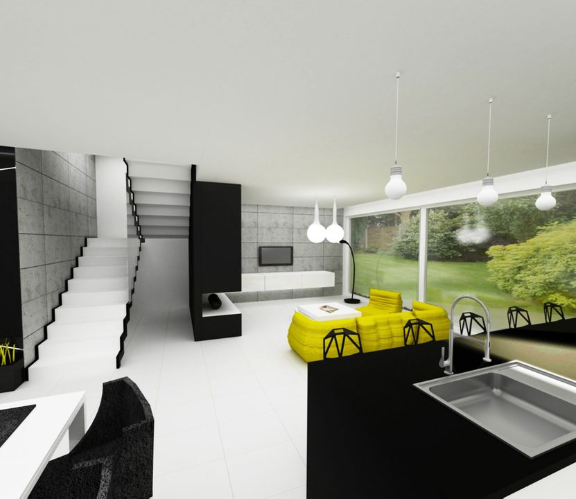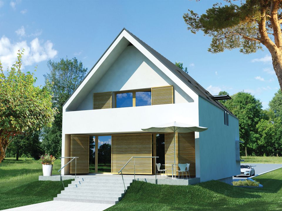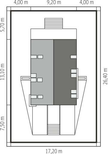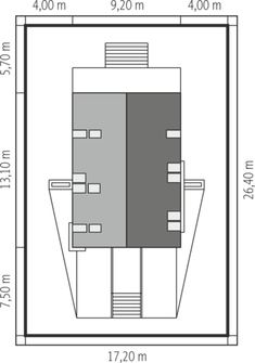 Graficzne opracowanie rzutów poglądowych widocznych na karcie projektu zostało wykonane przez Extradom.pl. Prezentowane przez Extradom.pl wizualizacje wykonane zostały przez autora projektu i należy poczytywać je jedynie za przykład i propozycję wykończenia, wizję architektoniczną autora projektu. Ostateczne wykończenie budynku może nastąpić na wiele sposobów. Szczegółowe rozwiązania zastosowane w oferowanej dokumentacji - w tym również ilość, lokalizacje i wygląd okien, drzwi, kominów - mogą w niewielkim stopniu różnić się od prezentowanej wizualizacji budynku.