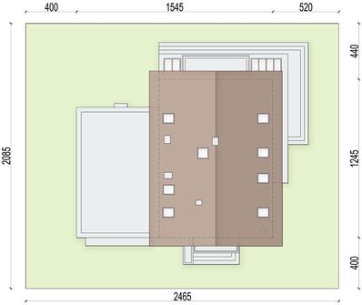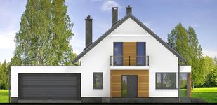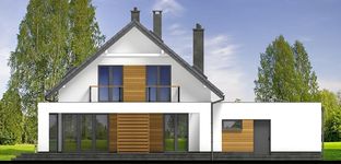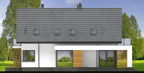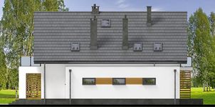 Graficzne opracowanie rzutów poglądowych widocznych na karcie projektu zostało wykonane przez Extradom.pl. Prezentowane przez Extradom.pl wizualizacje wykonane zostały przez autora projektu i należy poczytywać je jedynie za przykład i propozycję wykończenia, wizję architektoniczną autora projektu. Ostateczne wykończenie budynku może nastąpić na wiele sposobów. Szczegółowe rozwiązania zastosowane w oferowanej dokumentacji - w tym również ilość, lokalizacje i wygląd okien, drzwi, kominów - mogą w niewielkim stopniu różnić się od prezentowanej wizualizacji budynku.