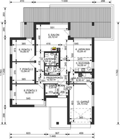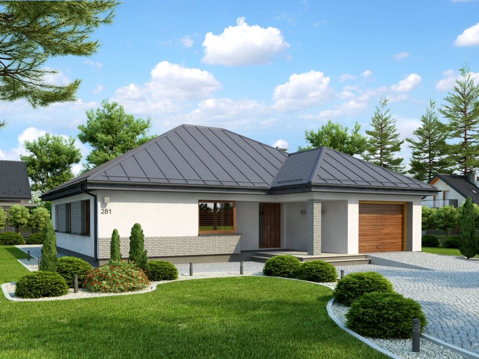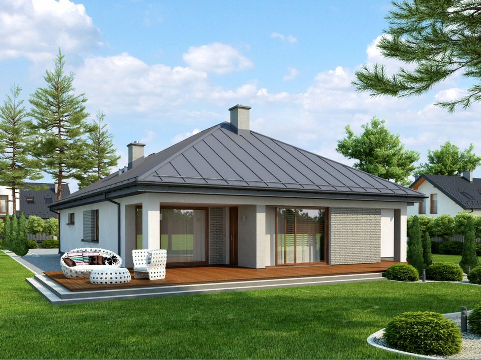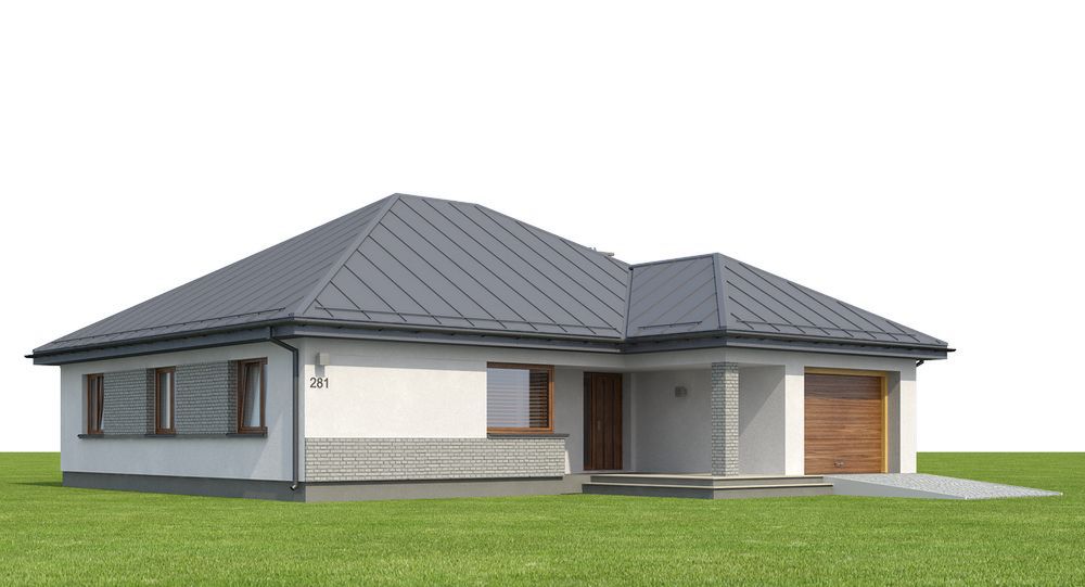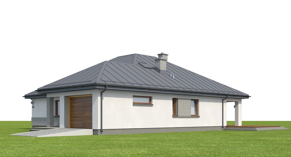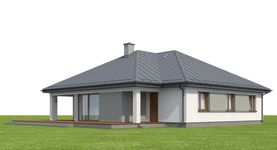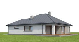 Graficzne opracowanie rzutów poglądowych widocznych na karcie projektu zostało wykonane przez Extradom.pl. Prezentowane przez Extradom.pl wizualizacje wykonane zostały przez autora projektu i należy poczytywać je jedynie za przykład i propozycję wykończenia, wizję architektoniczną autora projektu. Ostateczne wykończenie budynku może nastąpić na wiele sposobów. Szczegółowe rozwiązania zastosowane w oferowanej dokumentacji - w tym również ilość, lokalizacje i wygląd okien, drzwi, kominów - mogą w niewielkim stopniu różnić się od prezentowanej wizualizacji budynku.