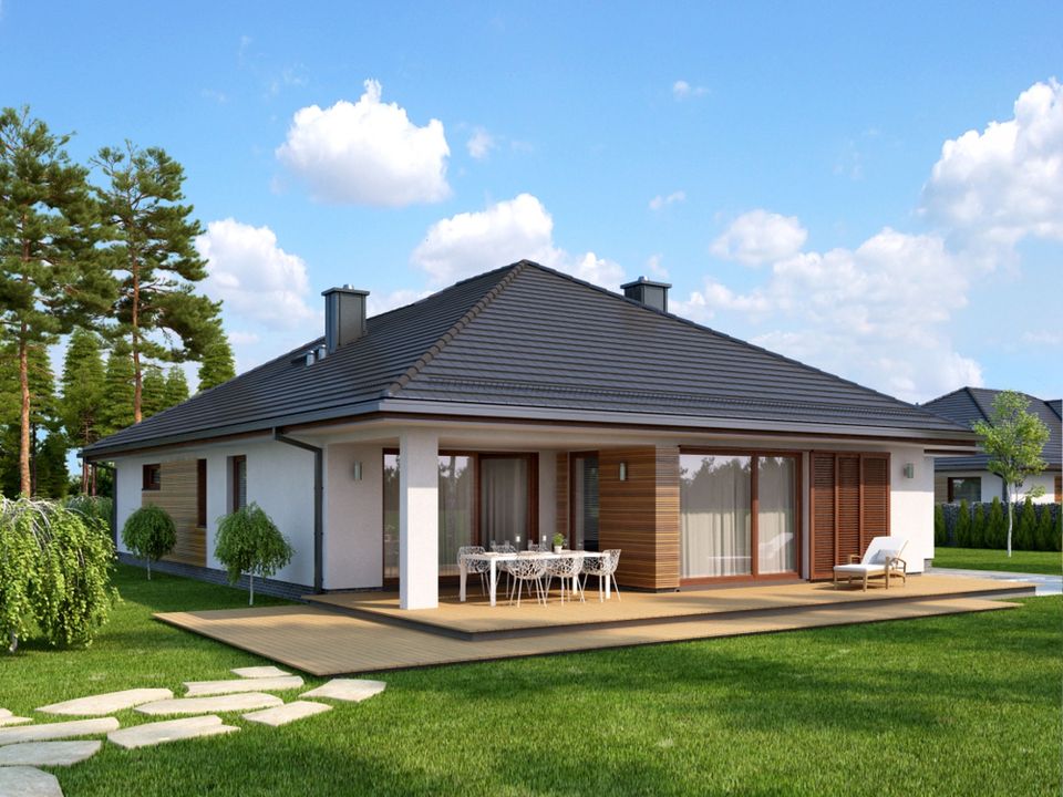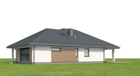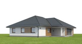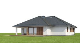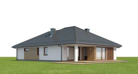 Graficzne opracowanie rzutów poglądowych widocznych na karcie projektu zostało wykonane przez Extradom.pl. Prezentowane przez Extradom.pl wizualizacje wykonane zostały przez autora projektu i należy poczytywać je jedynie za przykład i propozycję wykończenia, wizję architektoniczną autora projektu. Ostateczne wykończenie budynku może nastąpić na wiele sposobów. Szczegółowe rozwiązania zastosowane w oferowanej dokumentacji - w tym również ilość, lokalizacje i wygląd okien, drzwi, kominów - mogą w niewielkim stopniu różnić się od prezentowanej wizualizacji budynku.