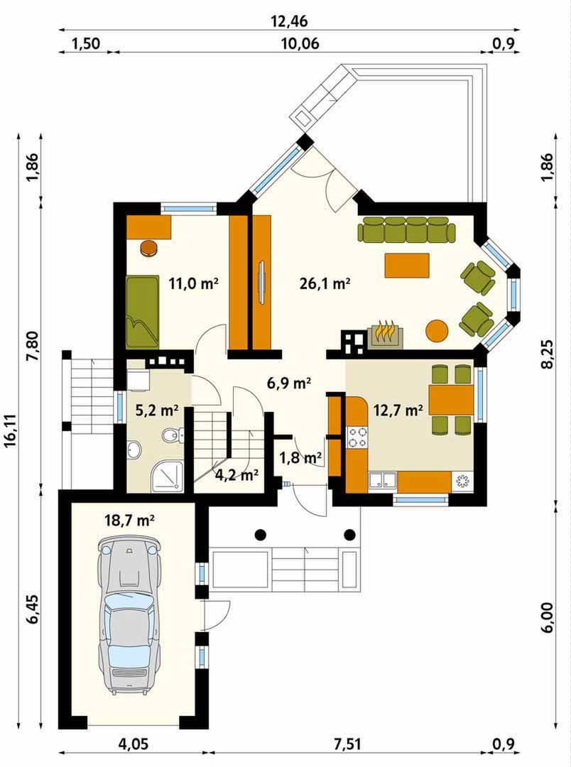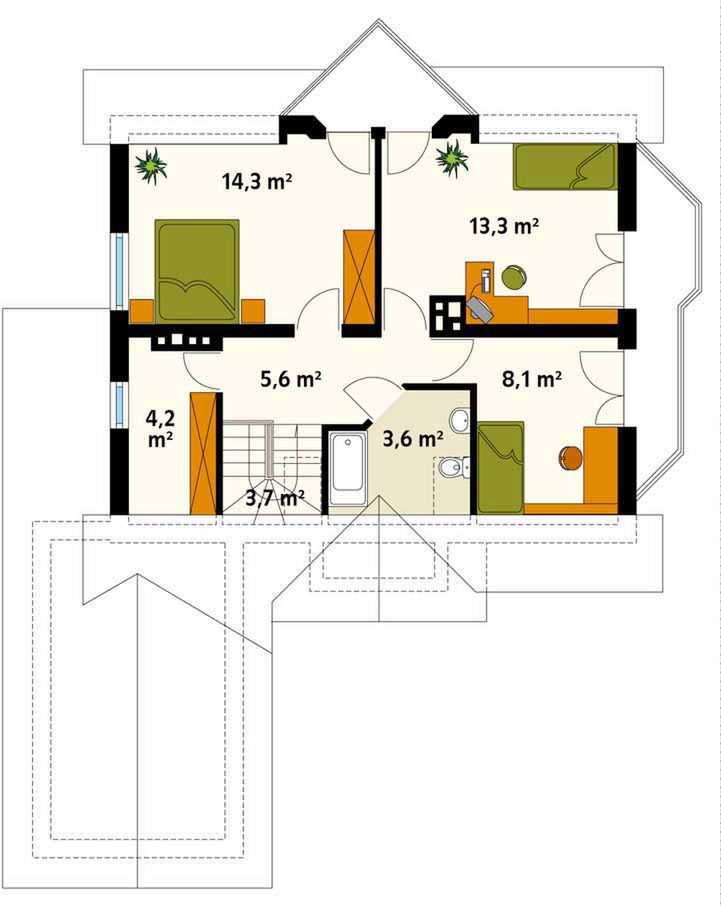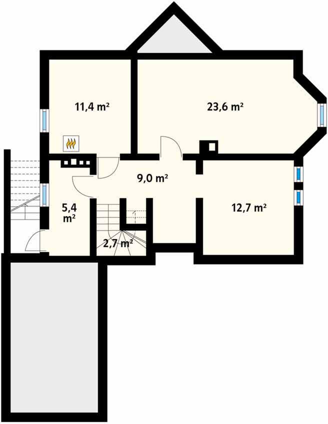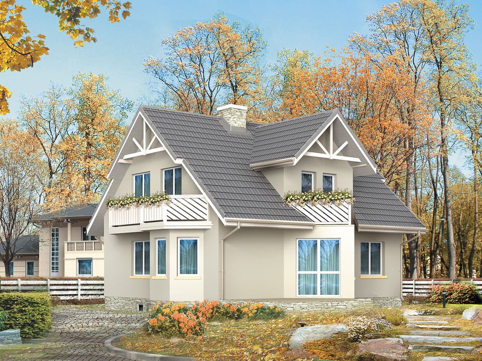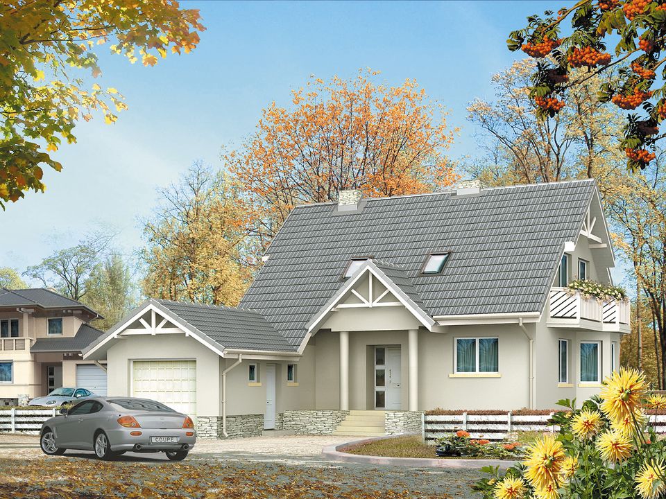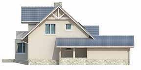 Graficzne opracowanie rzutów poglądowych widocznych na karcie projektu zostało wykonane przez Extradom.pl. Prezentowane przez Extradom.pl wizualizacje wykonane zostały przez autora projektu i należy poczytywać je jedynie za przykład i propozycję wykończenia, wizję architektoniczną autora projektu. Ostateczne wykończenie budynku może nastąpić na wiele sposobów. Szczegółowe rozwiązania zastosowane w oferowanej dokumentacji - w tym również ilość, lokalizacje i wygląd okien, drzwi, kominów - mogą w niewielkim stopniu różnić się od prezentowanej wizualizacji budynku.