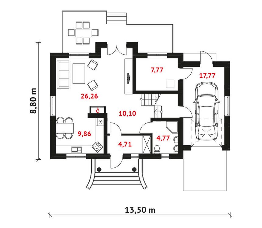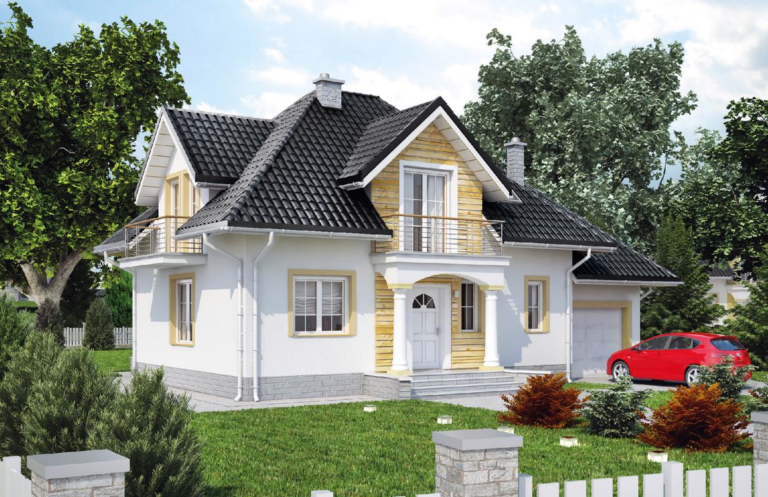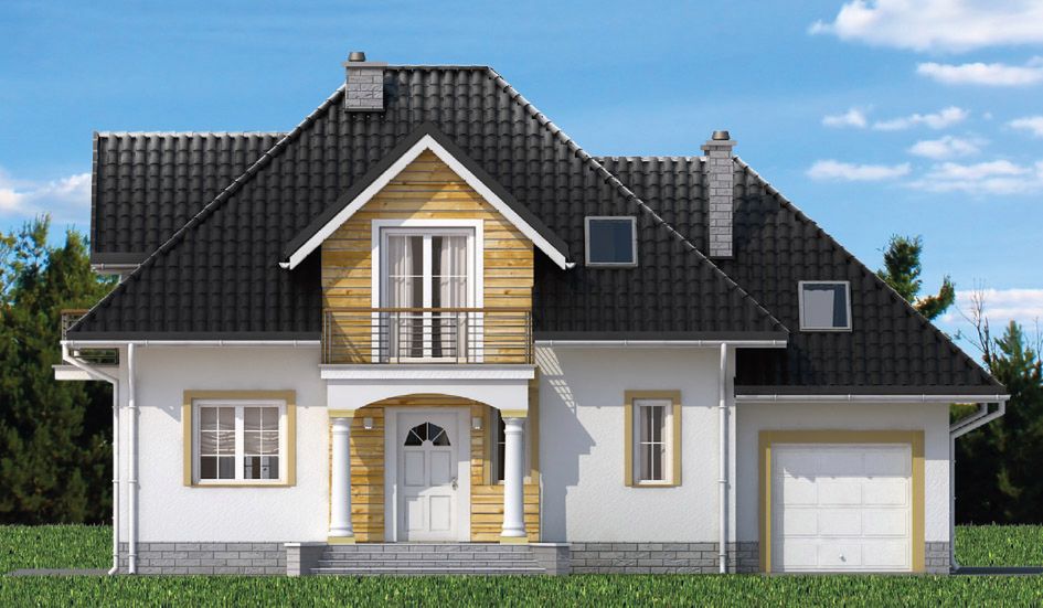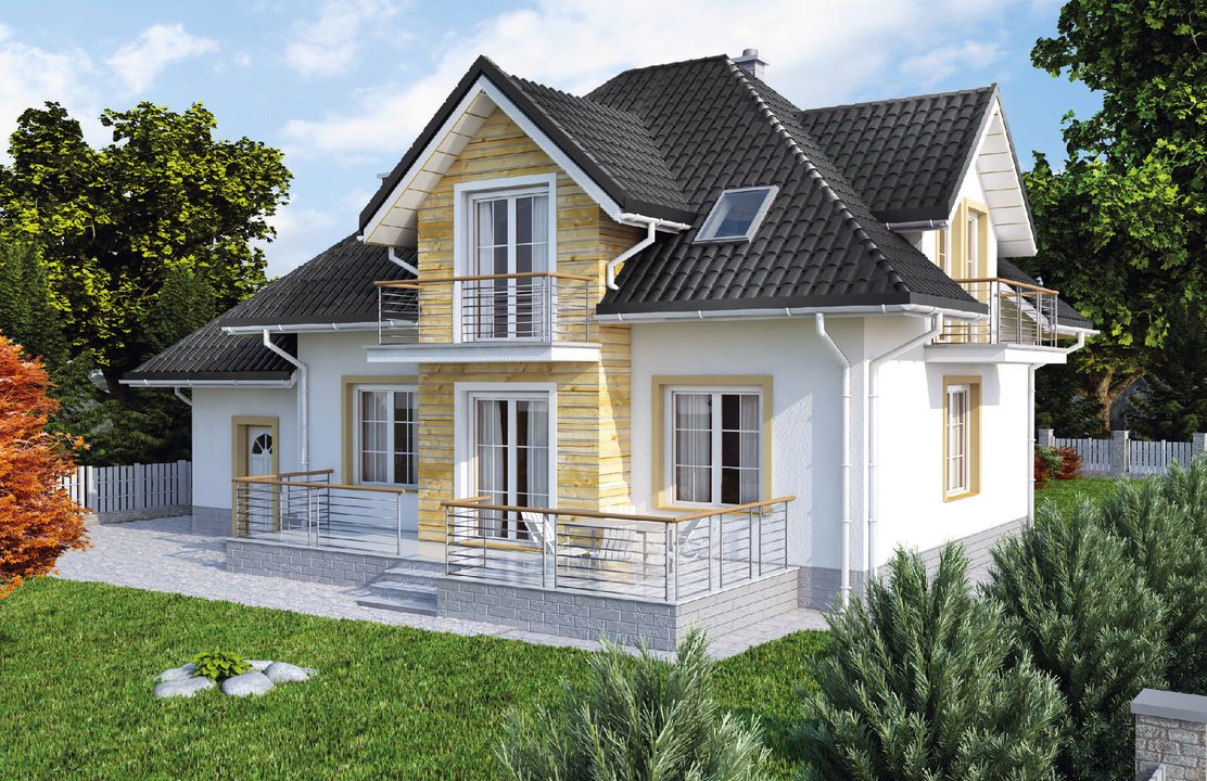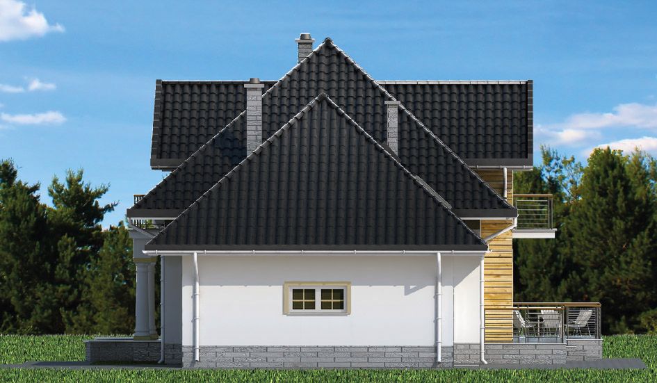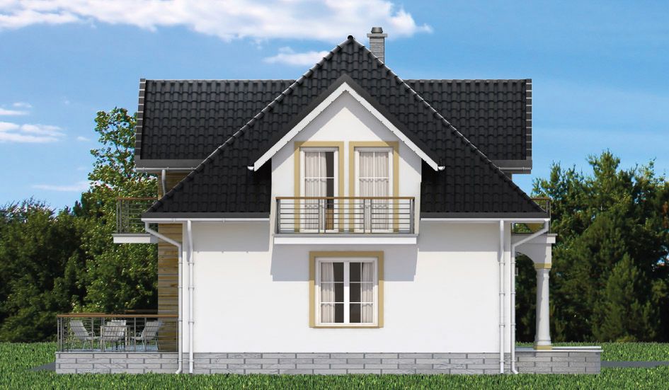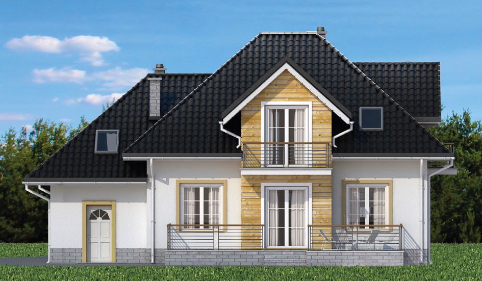 Graficzne opracowanie rzutów poglądowych widocznych na karcie projektu zostało wykonane przez Extradom.pl. Prezentowane przez Extradom.pl wizualizacje wykonane zostały przez autora projektu i należy poczytywać je jedynie za przykład i propozycję wykończenia, wizję architektoniczną autora projektu. Ostateczne wykończenie budynku może nastąpić na wiele sposobów. Szczegółowe rozwiązania zastosowane w oferowanej dokumentacji - w tym również ilość, lokalizacje i wygląd okien, drzwi, kominów - mogą w niewielkim stopniu różnić się od prezentowanej wizualizacji budynku.