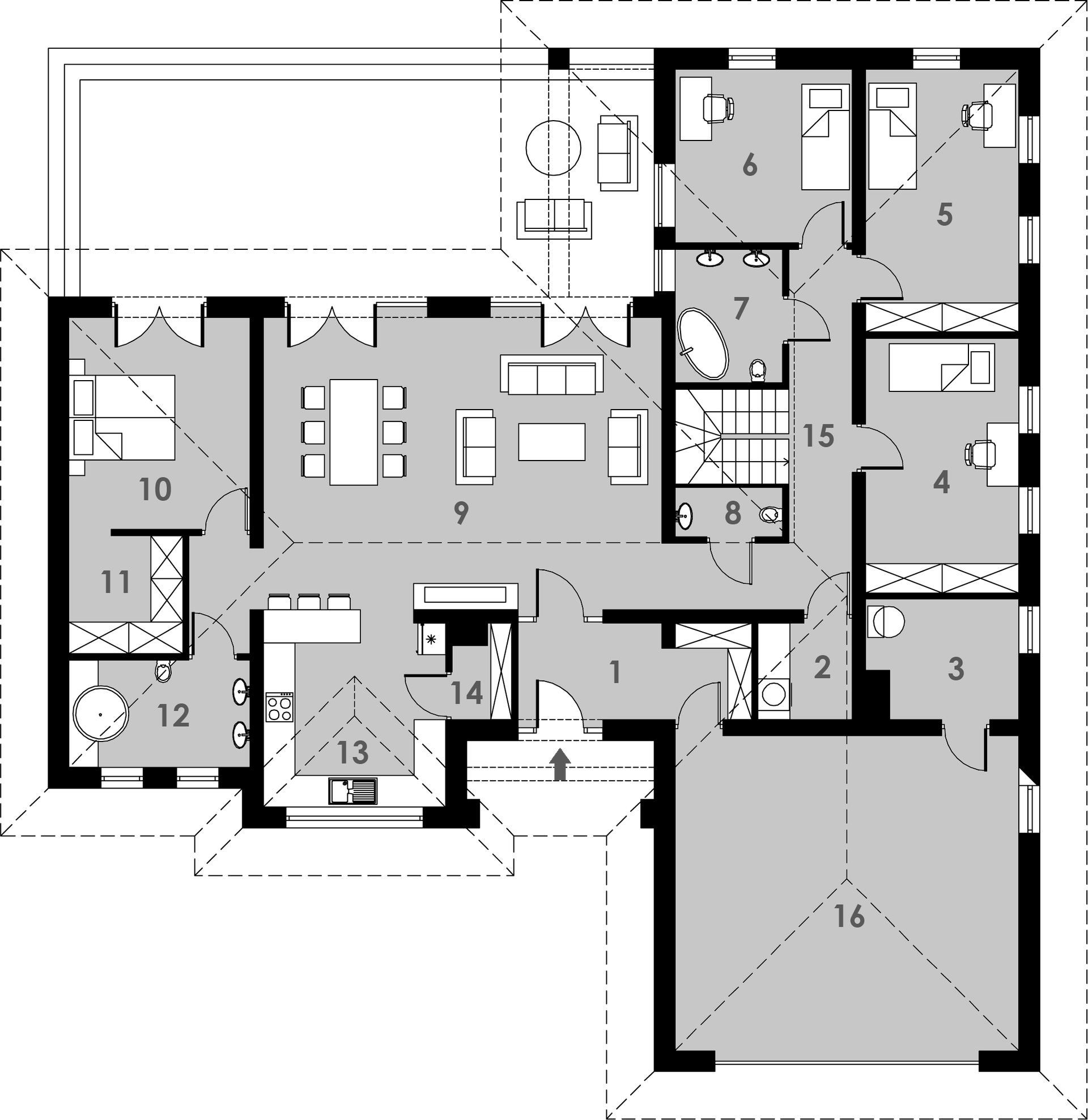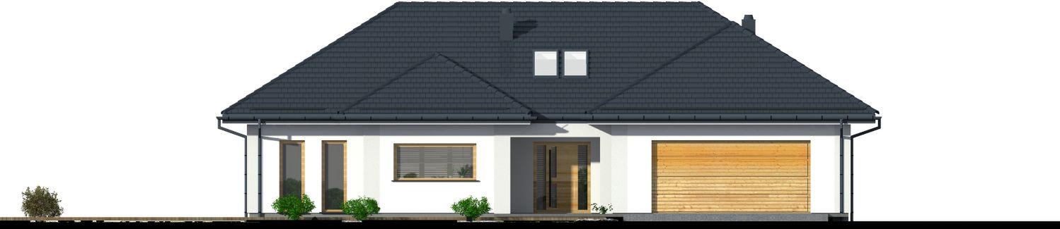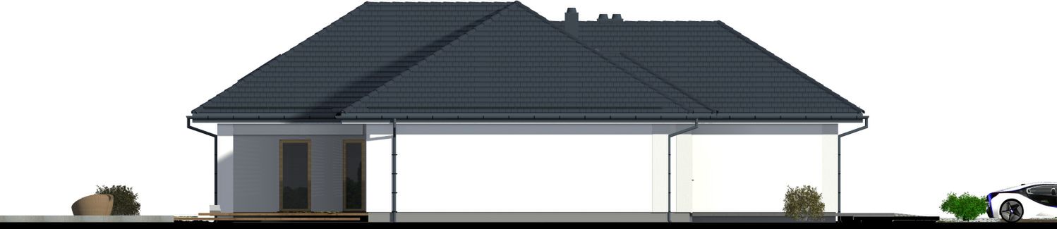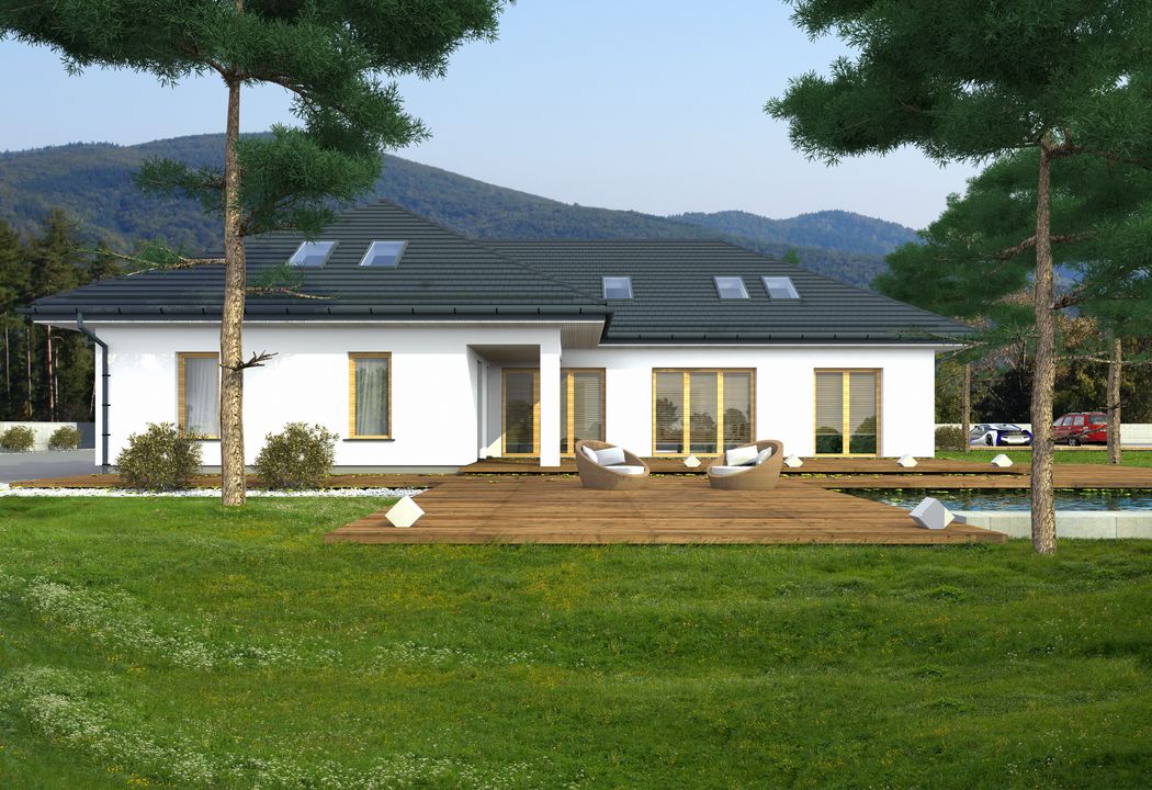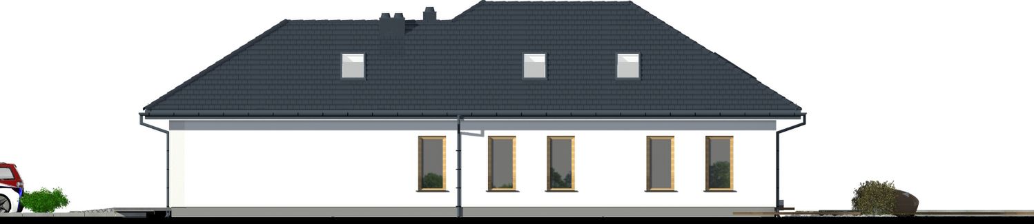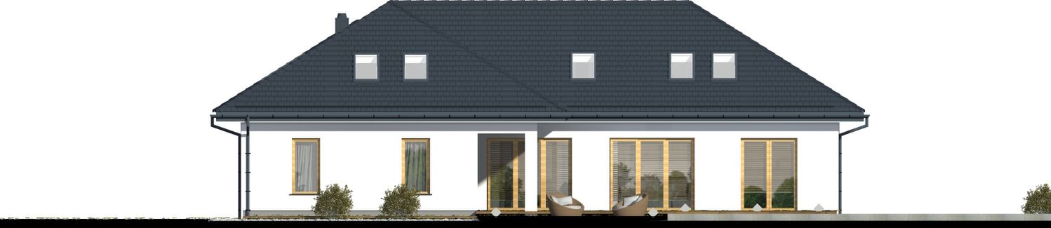 Graficzne opracowanie rzutów poglądowych widocznych na karcie projektu zostało wykonane przez Extradom.pl. Prezentowane przez Extradom.pl wizualizacje wykonane zostały przez autora projektu i należy poczytywać je jedynie za przykład i propozycję wykończenia, wizję architektoniczną autora projektu. Ostateczne wykończenie budynku może nastąpić na wiele sposobów. Szczegółowe rozwiązania zastosowane w oferowanej dokumentacji - w tym również ilość, lokalizacje i wygląd okien, drzwi, kominów - mogą w niewielkim stopniu różnić się od prezentowanej wizualizacji budynku.