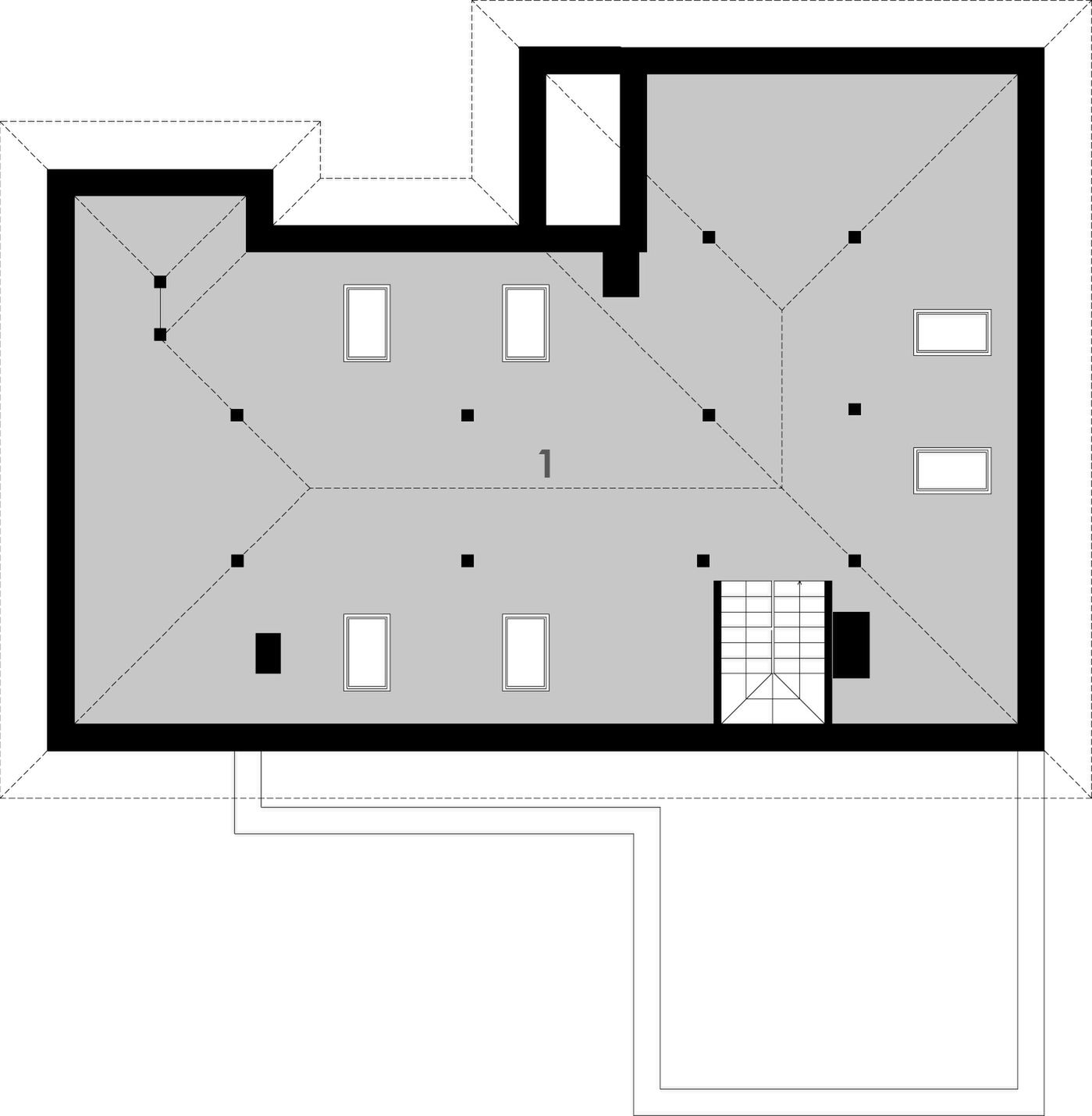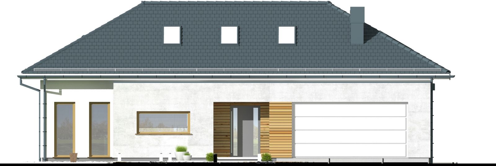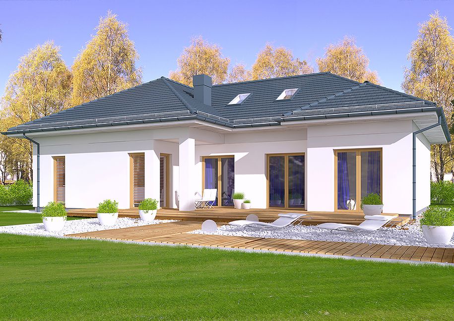 Graficzne opracowanie rzutów poglądowych widocznych na karcie projektu zostało wykonane przez Extradom.pl. Prezentowane przez Extradom.pl wizualizacje wykonane zostały przez autora projektu i należy poczytywać je jedynie za przykład i propozycję wykończenia, wizję architektoniczną autora projektu. Ostateczne wykończenie budynku może nastąpić na wiele sposobów. Szczegółowe rozwiązania zastosowane w oferowanej dokumentacji - w tym również ilość, lokalizacje i wygląd okien, drzwi, kominów - mogą w niewielkim stopniu różnić się od prezentowanej wizualizacji budynku.