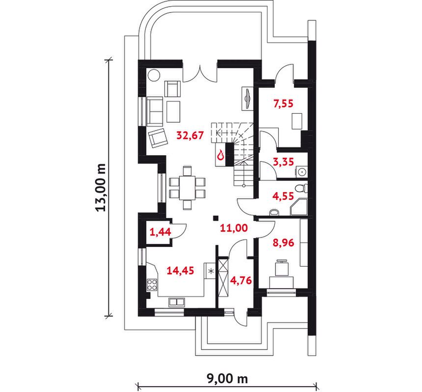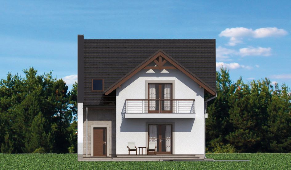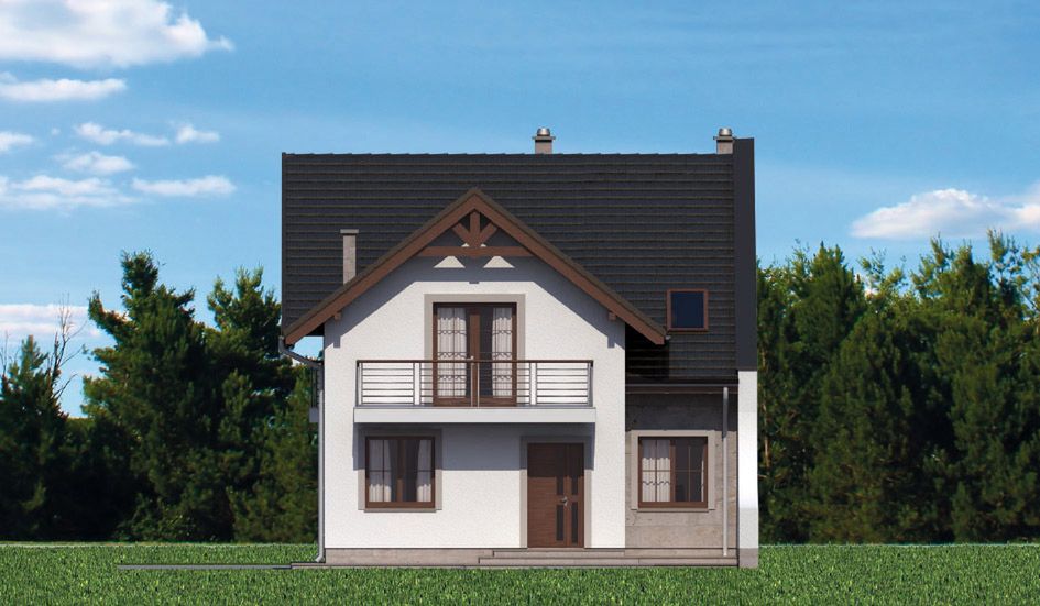 Graficzne opracowanie rzutów poglądowych widocznych na karcie projektu zostało wykonane przez Extradom.pl. Prezentowane przez Extradom.pl wizualizacje wykonane zostały przez autora projektu i należy poczytywać je jedynie za przykład i propozycję wykończenia, wizję architektoniczną autora projektu. Ostateczne wykończenie budynku może nastąpić na wiele sposobów. Szczegółowe rozwiązania zastosowane w oferowanej dokumentacji - w tym również ilość, lokalizacje i wygląd okien, drzwi, kominów - mogą w niewielkim stopniu różnić się od prezentowanej wizualizacji budynku.