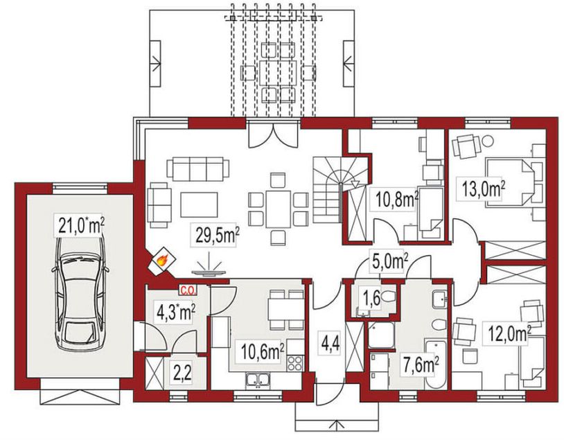 Graficzne opracowanie rzutów poglądowych widocznych na karcie projektu zostało wykonane przez Extradom.pl. Prezentowane przez Extradom.pl wizualizacje wykonane zostały przez autora projektu i należy poczytywać je jedynie za przykład i propozycję wykończenia, wizję architektoniczną autora projektu. Ostateczne wykończenie budynku może nastąpić na wiele sposobów. Szczegółowe rozwiązania zastosowane w oferowanej dokumentacji - w tym również ilość, lokalizacje i wygląd okien, drzwi, kominów - mogą w niewielkim stopniu różnić się od prezentowanej wizualizacji budynku.