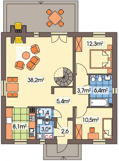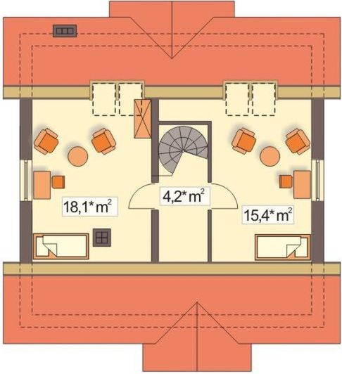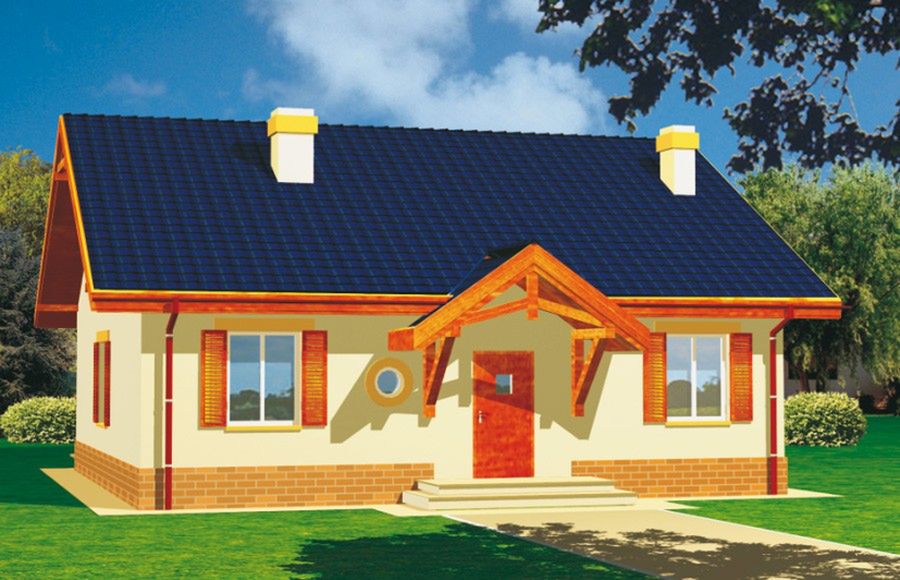 Graficzne opracowanie rzutów poglądowych widocznych na karcie projektu zostało wykonane przez Extradom.pl. Prezentowane przez Extradom.pl wizualizacje wykonane zostały przez autora projektu i należy poczytywać je jedynie za przykład i propozycję wykończenia, wizję architektoniczną autora projektu. Ostateczne wykończenie budynku może nastąpić na wiele sposobów. Szczegółowe rozwiązania zastosowane w oferowanej dokumentacji - w tym również ilość, lokalizacje i wygląd okien, drzwi, kominów - mogą w niewielkim stopniu różnić się od prezentowanej wizualizacji budynku.