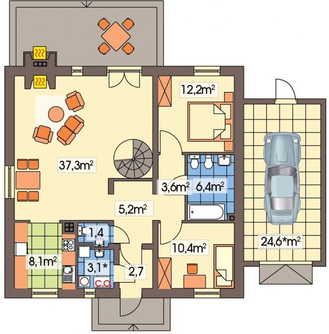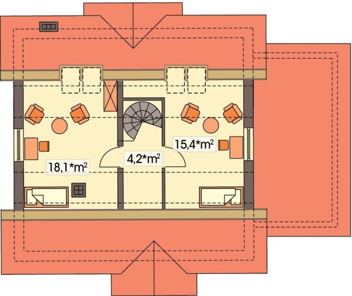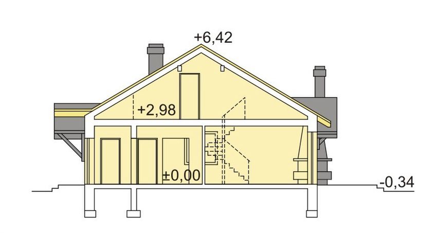 Graficzne opracowanie rzutów poglądowych widocznych na karcie projektu zostało wykonane przez Extradom.pl. Prezentowane przez Extradom.pl wizualizacje wykonane zostały przez autora projektu i należy poczytywać je jedynie za przykład i propozycję wykończenia, wizję architektoniczną autora projektu. Ostateczne wykończenie budynku może nastąpić na wiele sposobów. Szczegółowe rozwiązania zastosowane w oferowanej dokumentacji - w tym również ilość, lokalizacje i wygląd okien, drzwi, kominów - mogą w niewielkim stopniu różnić się od prezentowanej wizualizacji budynku.