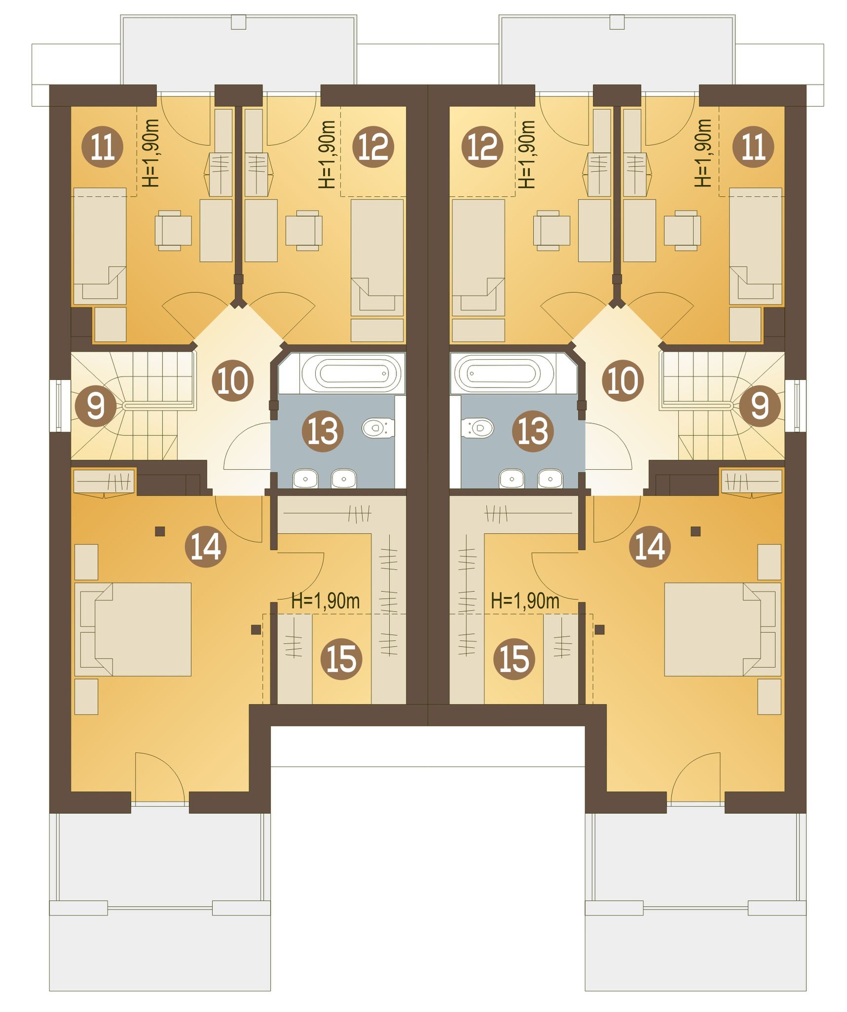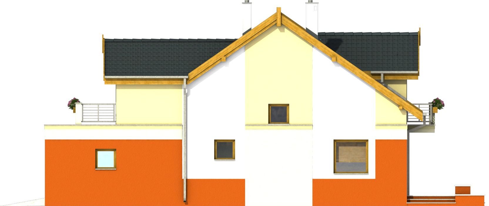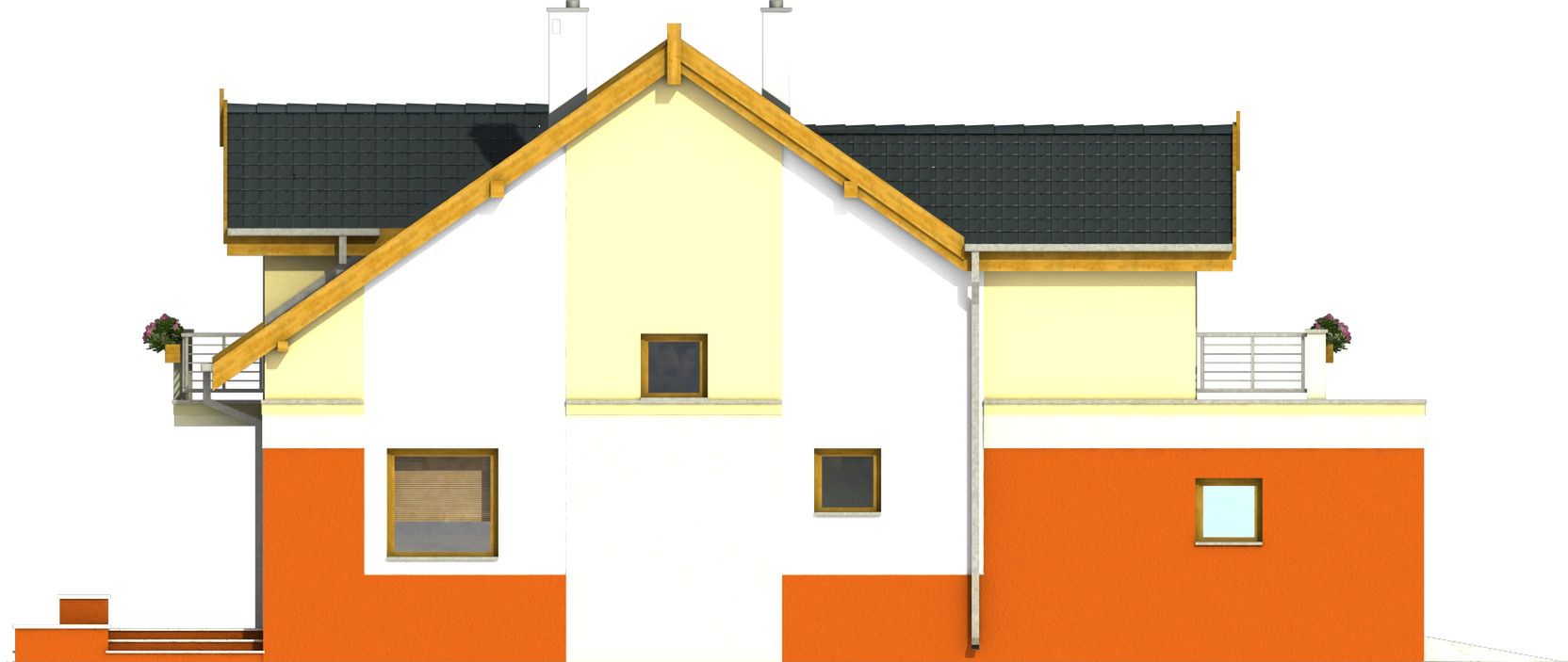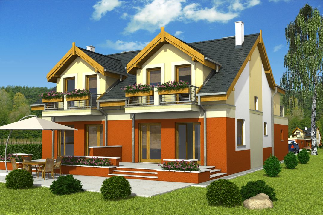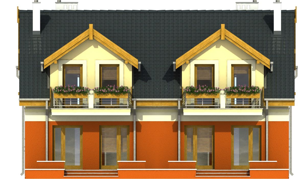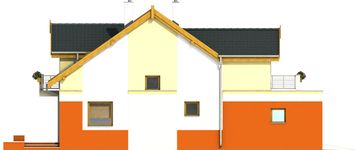 Graficzne opracowanie rzutów poglądowych widocznych na karcie projektu zostało wykonane przez Extradom.pl. Prezentowane przez Extradom.pl wizualizacje wykonane zostały przez autora projektu i należy poczytywać je jedynie za przykład i propozycję wykończenia, wizję architektoniczną autora projektu. Ostateczne wykończenie budynku może nastąpić na wiele sposobów. Szczegółowe rozwiązania zastosowane w oferowanej dokumentacji - w tym również ilość, lokalizacje i wygląd okien, drzwi, kominów - mogą w niewielkim stopniu różnić się od prezentowanej wizualizacji budynku.