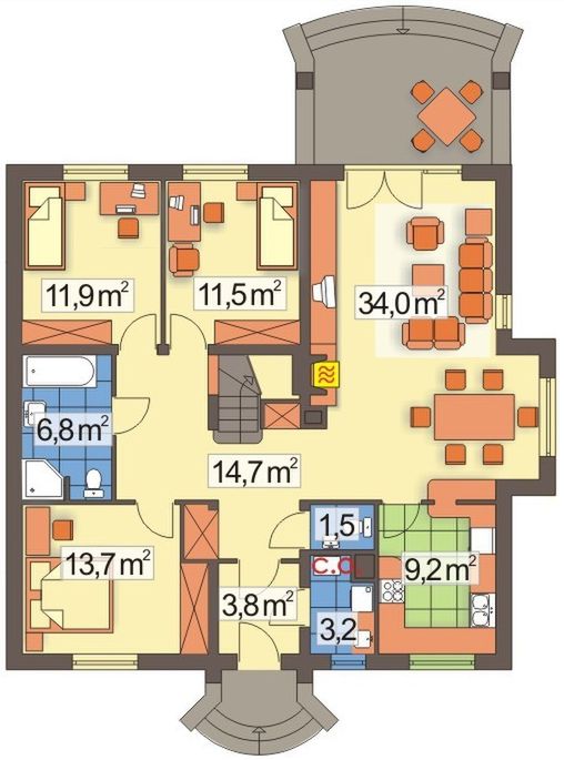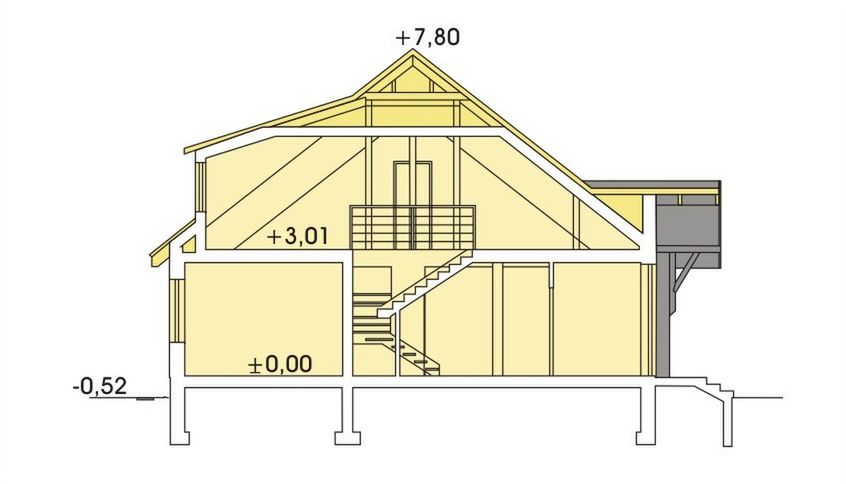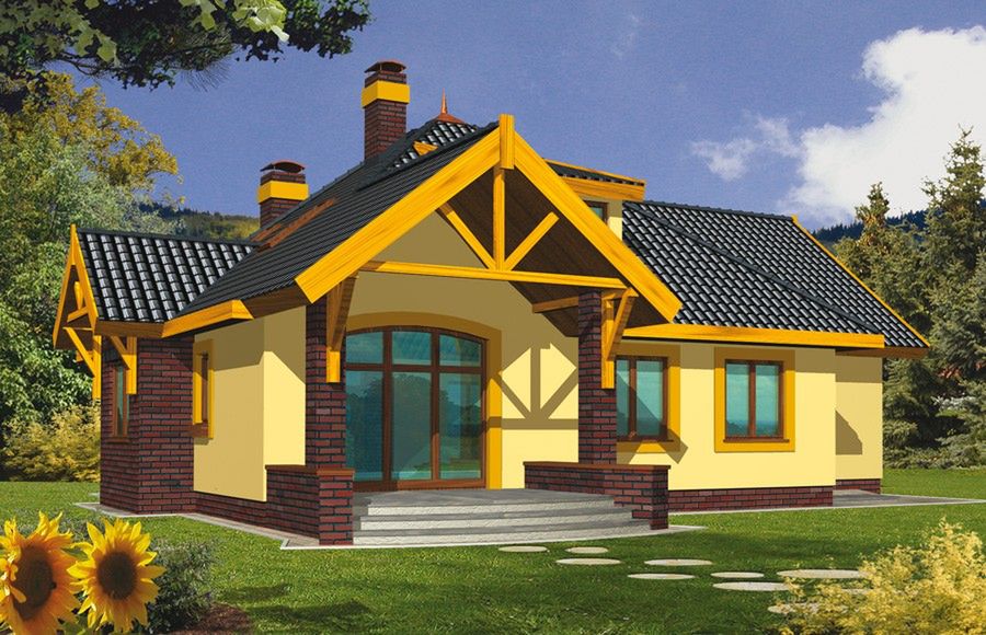 Graficzne opracowanie rzutów poglądowych widocznych na karcie projektu zostało wykonane przez Extradom.pl. Prezentowane przez Extradom.pl wizualizacje wykonane zostały przez autora projektu i należy poczytywać je jedynie za przykład i propozycję wykończenia, wizję architektoniczną autora projektu. Ostateczne wykończenie budynku może nastąpić na wiele sposobów. Szczegółowe rozwiązania zastosowane w oferowanej dokumentacji - w tym również ilość, lokalizacje i wygląd okien, drzwi, kominów - mogą w niewielkim stopniu różnić się od prezentowanej wizualizacji budynku.