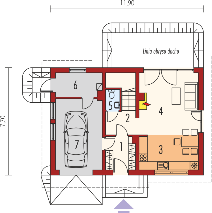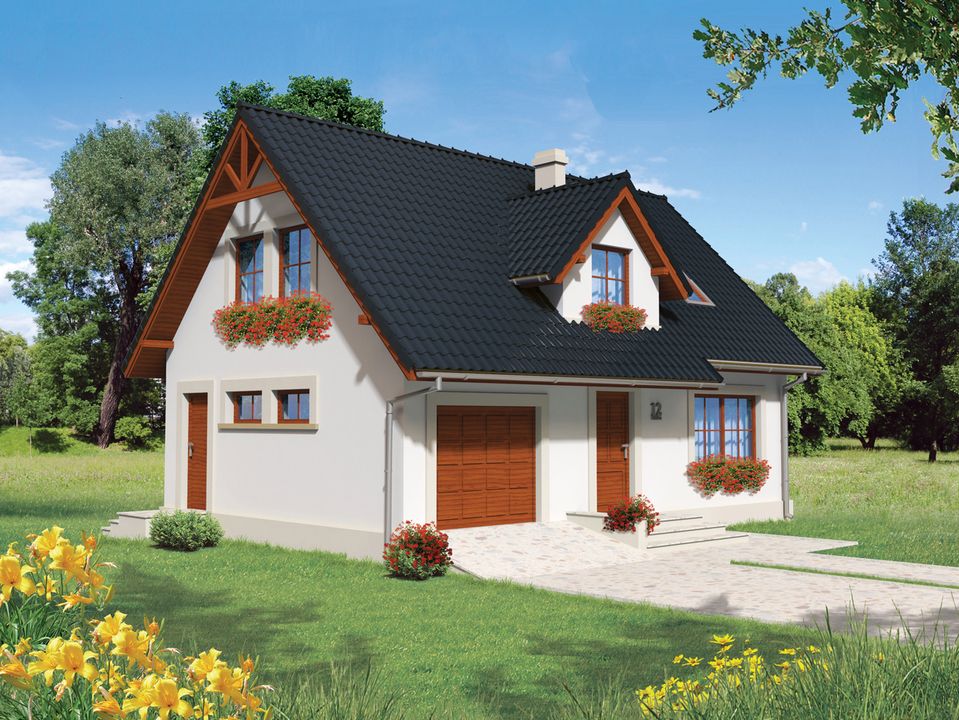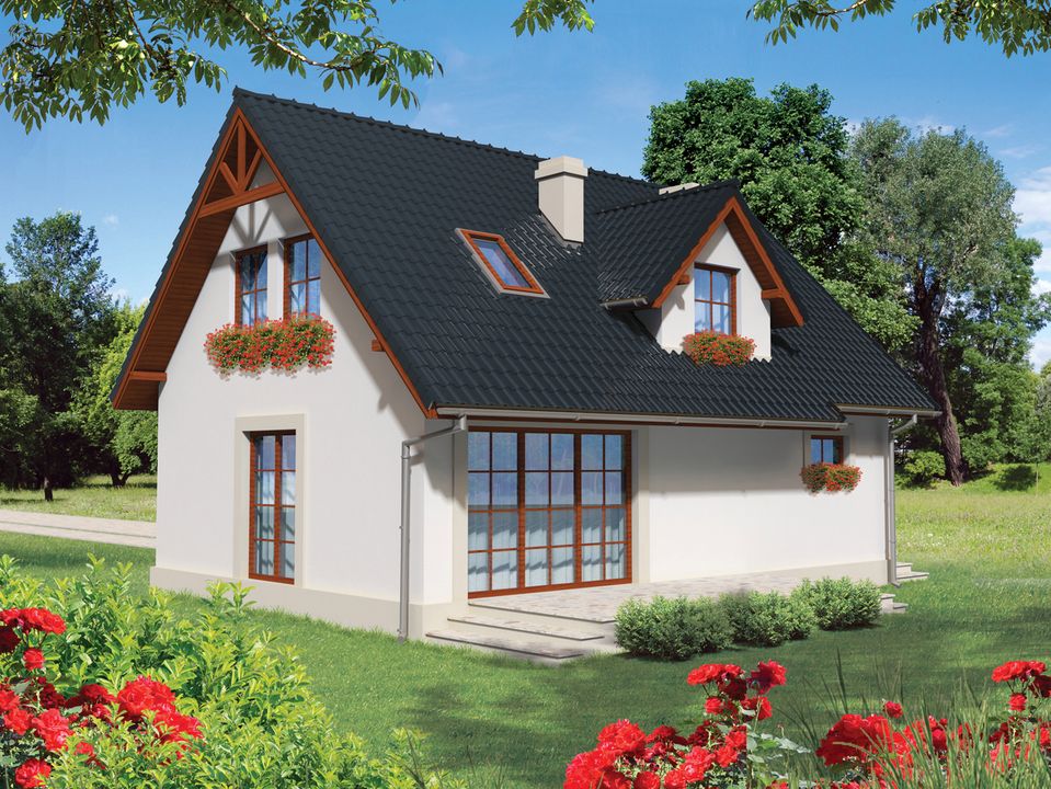 Graficzne opracowanie rzutów poglądowych widocznych na karcie projektu zostało wykonane przez Extradom.pl. Prezentowane przez Extradom.pl wizualizacje wykonane zostały przez autora projektu i należy poczytywać je jedynie za przykład i propozycję wykończenia, wizję architektoniczną autora projektu. Ostateczne wykończenie budynku może nastąpić na wiele sposobów. Szczegółowe rozwiązania zastosowane w oferowanej dokumentacji - w tym również ilość, lokalizacje i wygląd okien, drzwi, kominów - mogą w niewielkim stopniu różnić się od prezentowanej wizualizacji budynku.