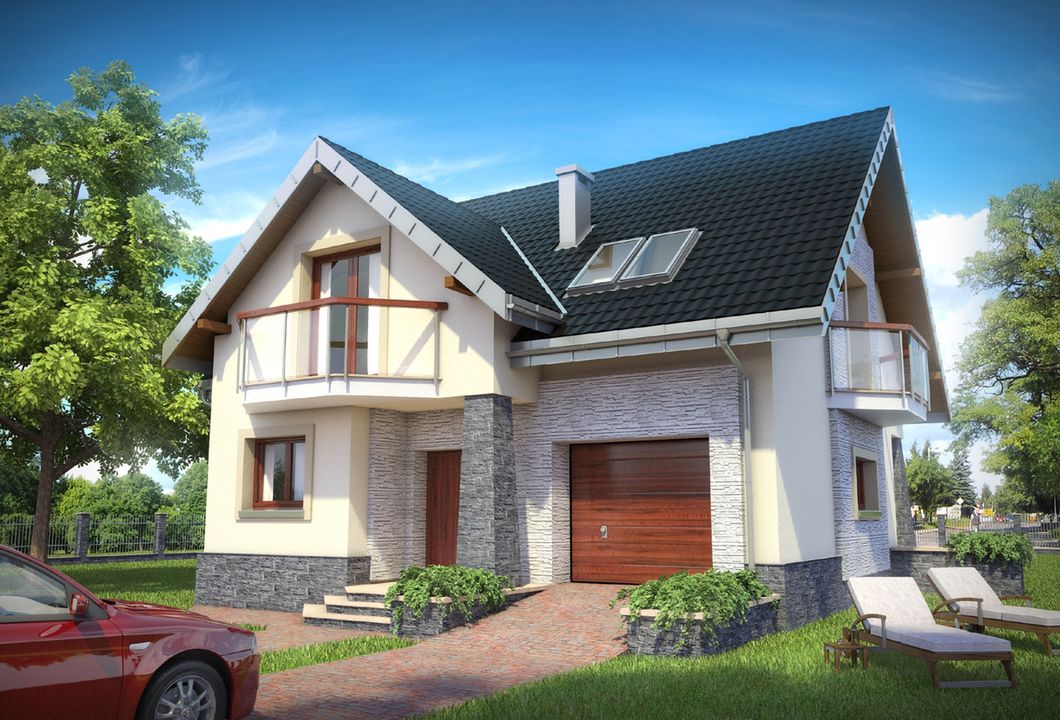 Graficzne opracowanie rzutów poglądowych widocznych na karcie projektu zostało wykonane przez Extradom.pl. Prezentowane przez Extradom.pl wizualizacje wykonane zostały przez autora projektu i należy poczytywać je jedynie za przykład i propozycję wykończenia, wizję architektoniczną autora projektu. Ostateczne wykończenie budynku może nastąpić na wiele sposobów. Szczegółowe rozwiązania zastosowane w oferowanej dokumentacji - w tym również ilość, lokalizacje i wygląd okien, drzwi, kominów - mogą w niewielkim stopniu różnić się od prezentowanej wizualizacji budynku.