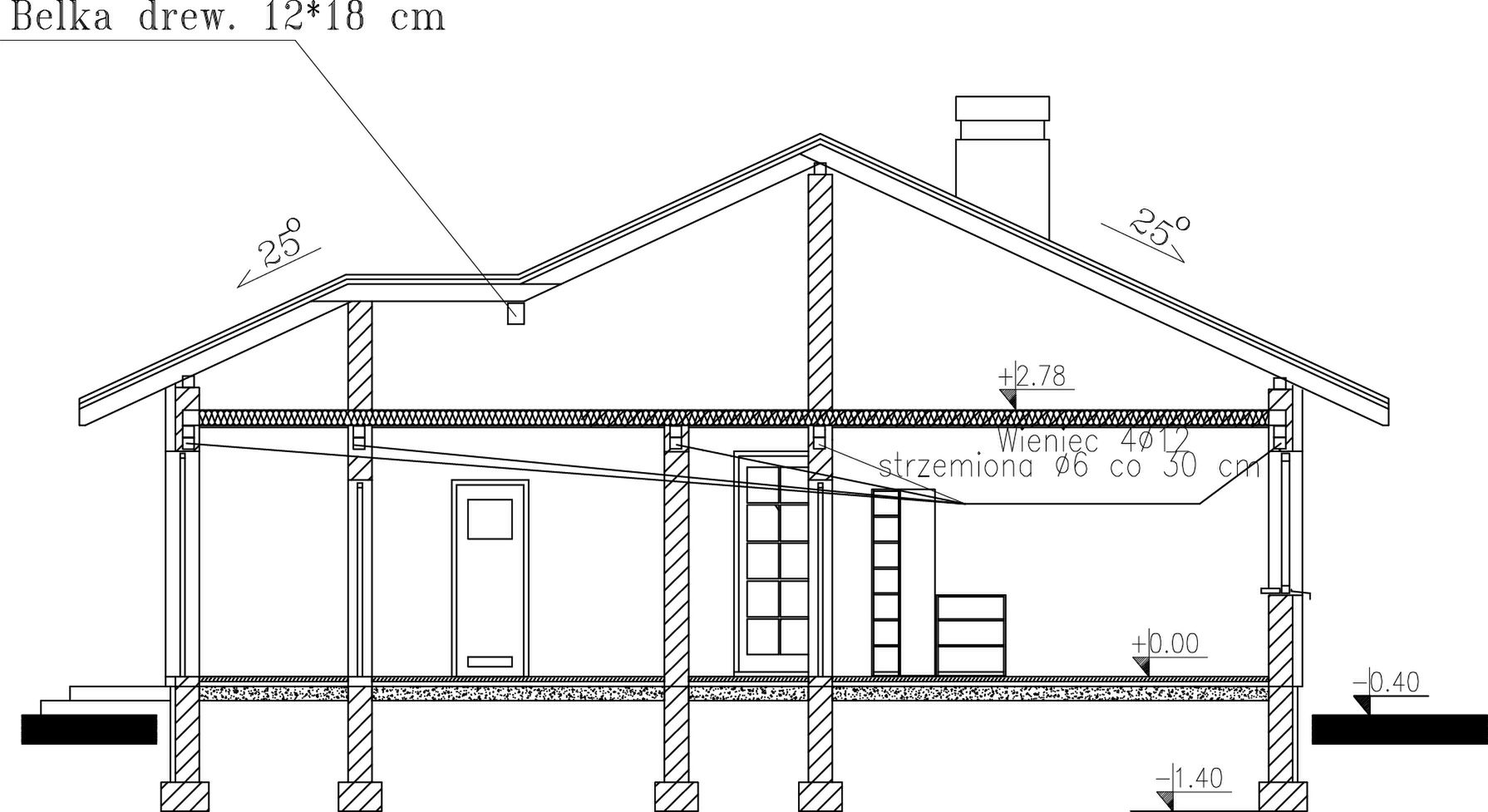 Ławy fundamentowe żelbetowe. Ściany zewnętrzne dwuwarstwowe z pustaków ceramicznych ocieplonych styropianem, ściany wewnętrzne nośne z pustaków ceramicznych, ścianki działowe z cegły dziurawki lub płyt GK, strop żelbetowy monolityczny, więźba dachowa drewniana, kryta dachówką cementową lub ceramiczną. Możliwe jest zastosowanie ogrzewania gazowego, elektrycznego lub kominkowego.