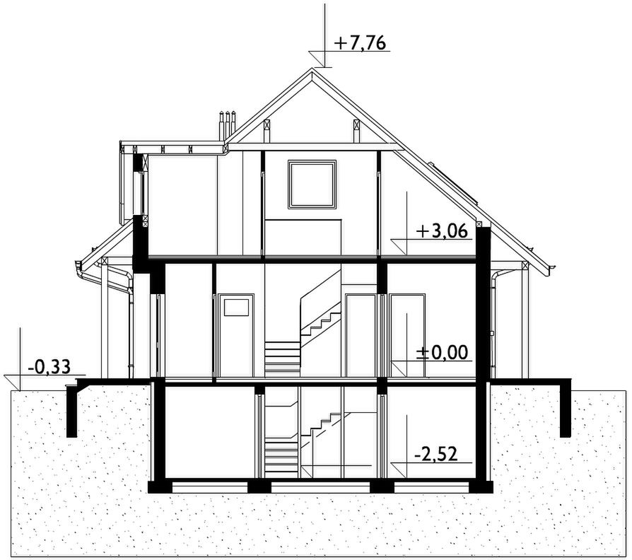 Wersja technologiczna: murowana - beton komórkowy. Strop: żelbetowy monolityczny. Typ schodów: płytowe żelbetowe. Konstrukcja dachu: drewniana płatwiowa. Typ ogrzewania: Kocioł na gaz. Dostępna wersja z pompą ciepła: Tak. Ściany zewnętrzne: 24 cm beton komórkowy. Ściany wewnętrzne: 24 cm beton komórkowy. Ściany wewnętrzne działowe: 12 cm beton komórkowy.