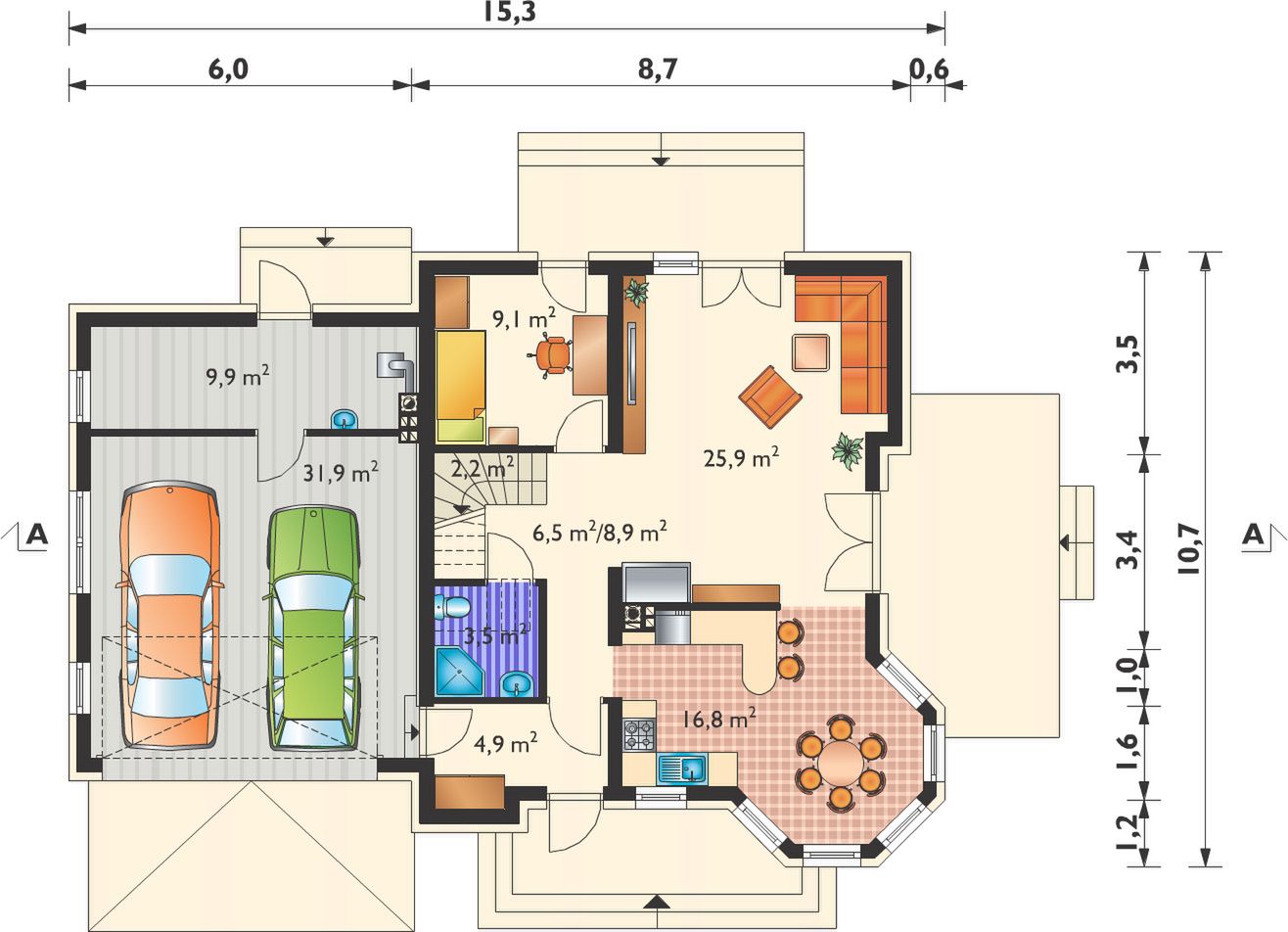 Graficzne opracowanie rzutów poglądowych widocznych na karcie projektu zostało wykonane przez Extradom.pl. Prezentowane przez Extradom.pl wizualizacje wykonane zostały przez autora projektu i należy poczytywać je jedynie za przykład i propozycję wykończenia, wizję architektoniczną autora projektu. Ostateczne wykończenie budynku może nastąpić na wiele sposobów. Szczegółowe rozwiązania zastosowane w oferowanej dokumentacji - w tym również ilość, lokalizacje i wygląd okien, drzwi, kominów - mogą w niewielkim stopniu różnić się od prezentowanej wizualizacji budynku.