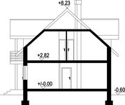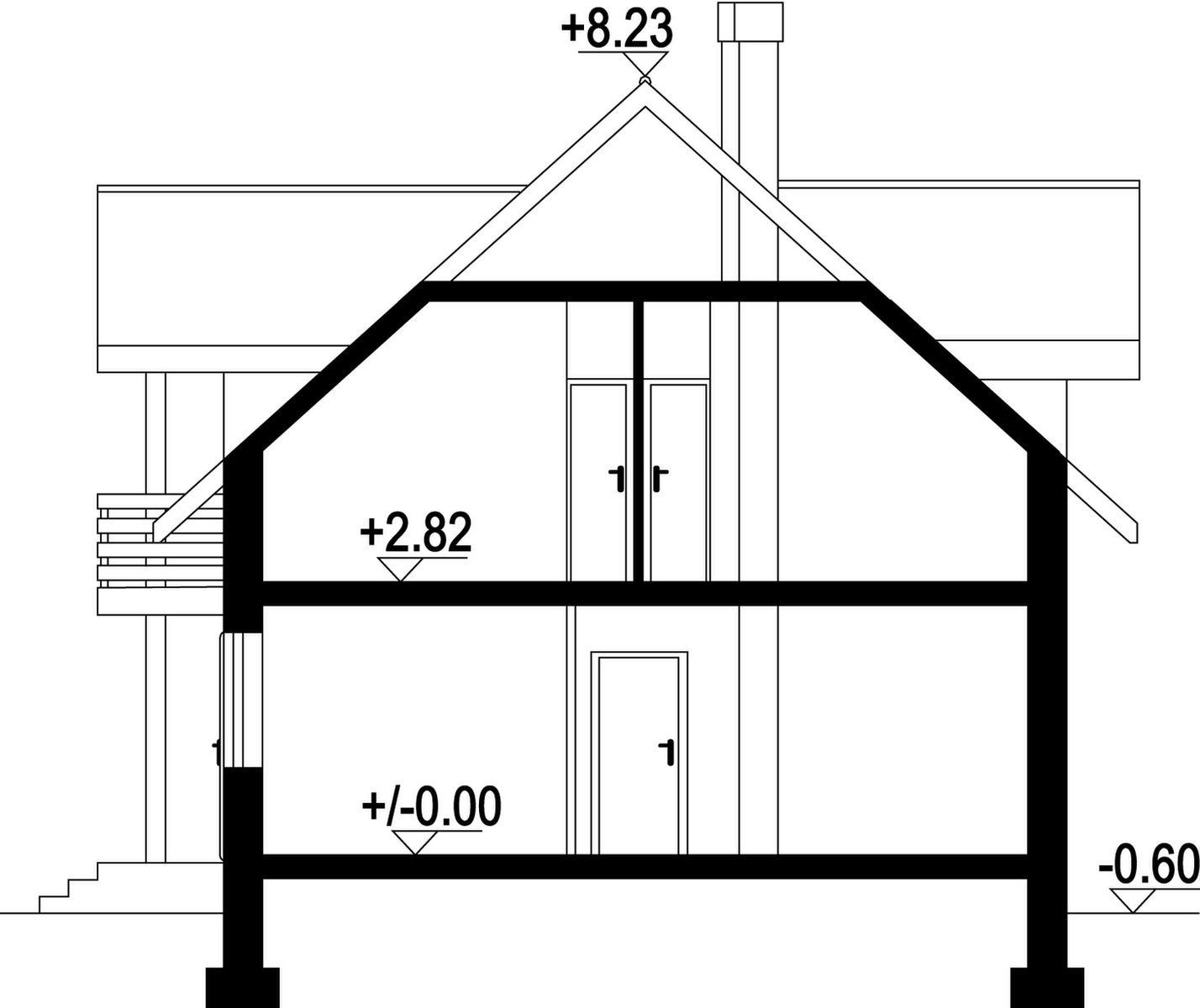 Wys. ścianki kolankowej 1.1 m Ilość drewna na więźbę 7.9 m³. Strop: płyta żelbetowa. Pokrycie dachu: dachówka ceramiczna. Ściany wewnętrzne: pustaki ceramiczne. Ściany zewnętrzne: pustaki ceramiczne + styropian. Typ ogrzewania: kocioł gazowy.