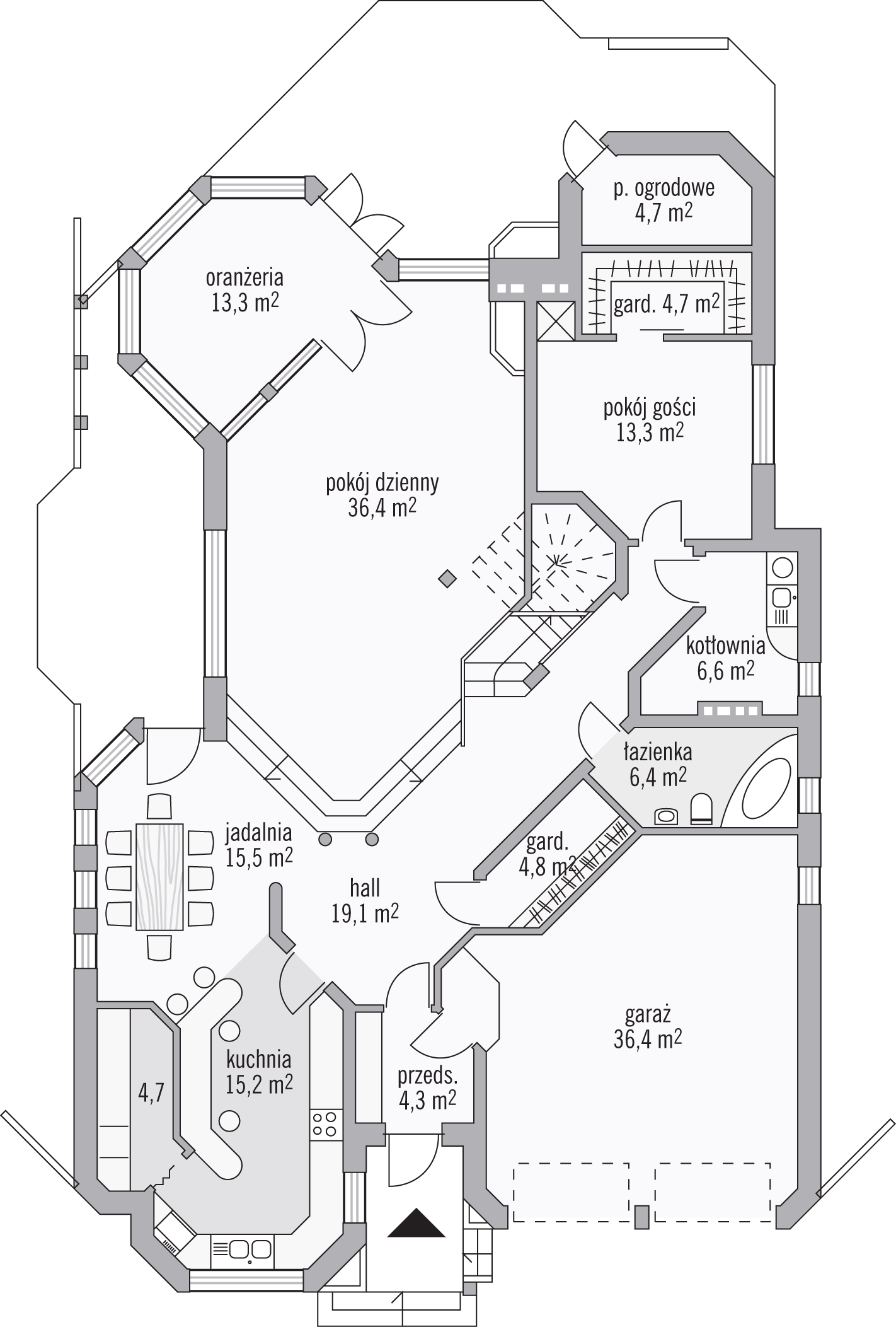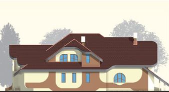 Graficzne opracowanie rzutów poglądowych widocznych na karcie projektu zostało wykonane przez Extradom.pl. Prezentowane przez Extradom.pl wizualizacje wykonane zostały przez autora projektu i należy poczytywać je jedynie za przykład i propozycję wykończenia, wizję architektoniczną autora projektu. Ostateczne wykończenie budynku może nastąpić na wiele sposobów. Szczegółowe rozwiązania zastosowane w oferowanej dokumentacji - w tym również ilość, lokalizacje i wygląd okien, drzwi, kominów - mogą w niewielkim stopniu różnić się od prezentowanej wizualizacji budynku.