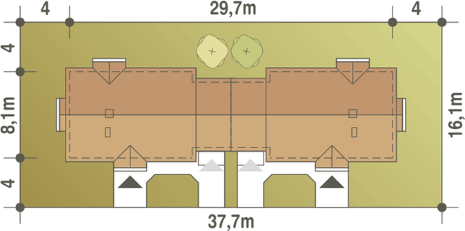Projekt jest w fazie koncepcji. Przy zakupie projektu należy zapłacić 50% zaliczki. Zaliczka jest bezzwrotna w przypadku zwrotu lub rezygnacji z zamówienia. Budynek dwulokalowy posadowiony na wspólnym fundamencie. Jeśli planujesz budowę na osobnych działkach zamów pojedyncze segmenty: podstawa + lustro.