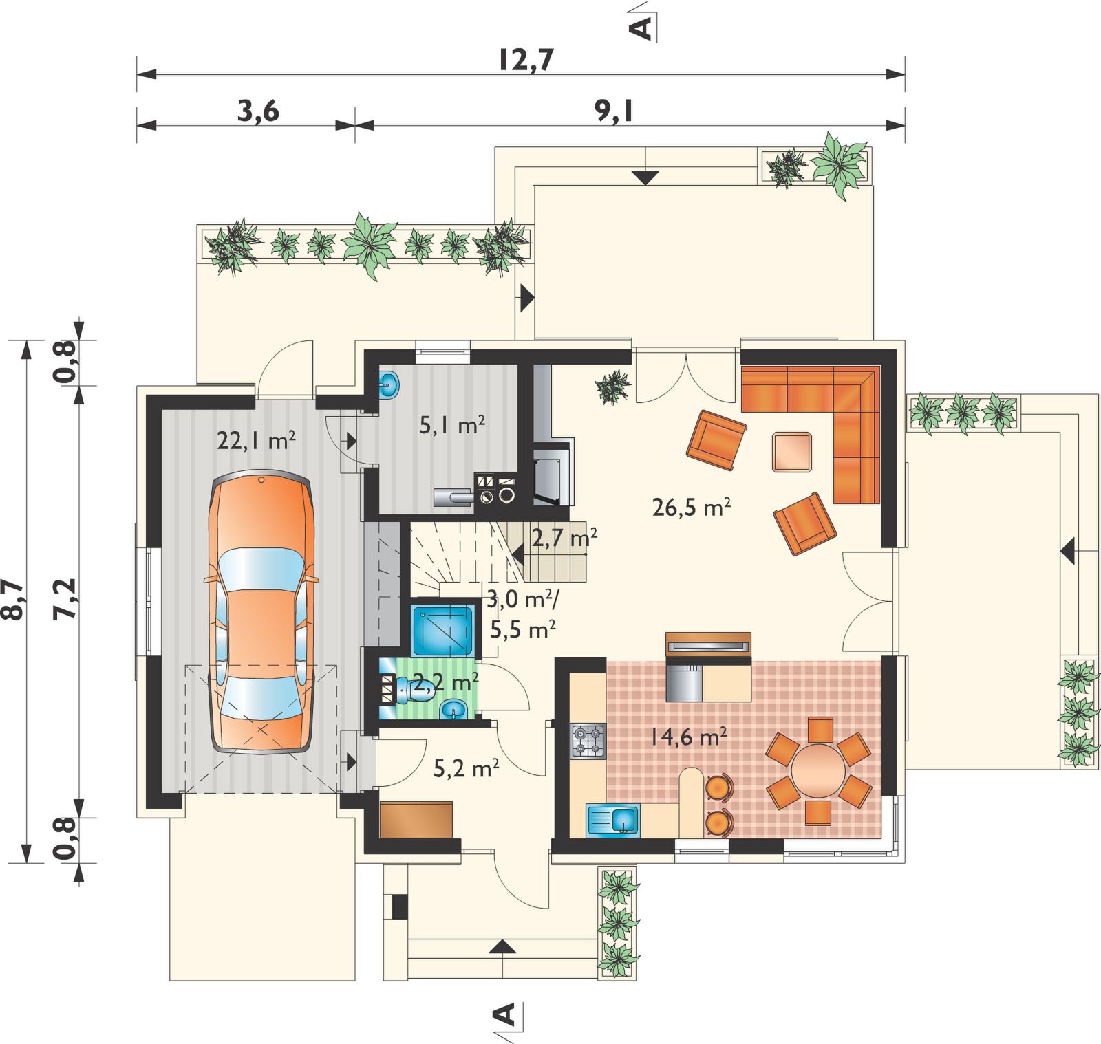 Ściany zewnętrzne: bloczki silikatowe n25 na zaprawie + docieplenie styropian gr. 15 cm. Ściany wewnętrzne: bloczki silikatowe a lub aplus gr. 25 cm, działowe: bloczki silikatowe a gr. 12 cm. Strop: lekki strop panelowy smart. Konstrukcja dachu: drewniana, jętkowa. Rodzaj schodów: żelbetowe. Typ ogrzewania: kocioł na gaz. Aneks na paliwo stałe: na zamówienie. Pokrycie dachu: dachówka betonowa lub ceramiczna. Elewacja: tynki, częściowo płytki klinkierowe.