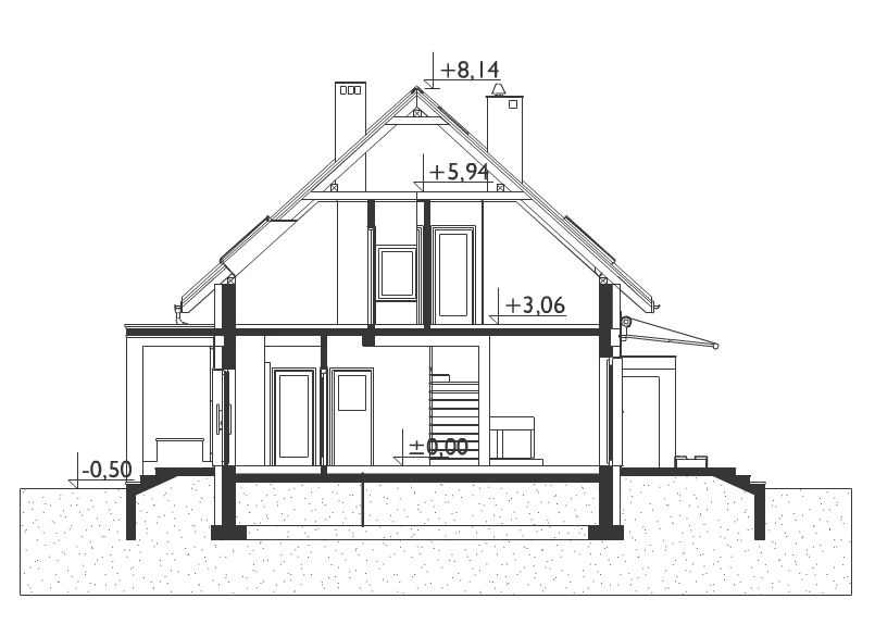 Wersja technologiczna: murowana - beton komórkowy. Strop: lekki strop panelowy Smart firmy Konbet. Typ schodów: płytowe żelbetowe. Konstrukcja dachu: drewniana krokwiowo-jętkowa. Typ ogrzewania: Kocioł na gaz. Dostępna wersja z pompą ciepła: Tak. Ściany zewnętrzne: 24 cm beton komórkowy. Ściany wewnętrzne: 24 cm beton komórkowy. Ściany wewnętrzne działowe: 12 cm beton komórkowy.
