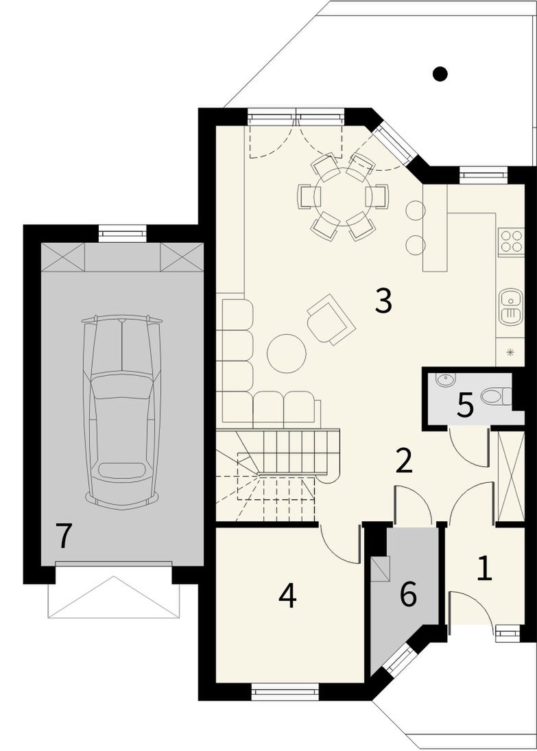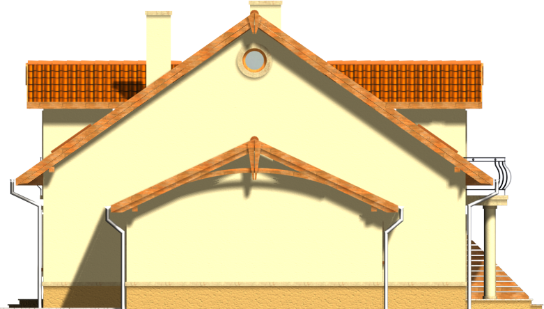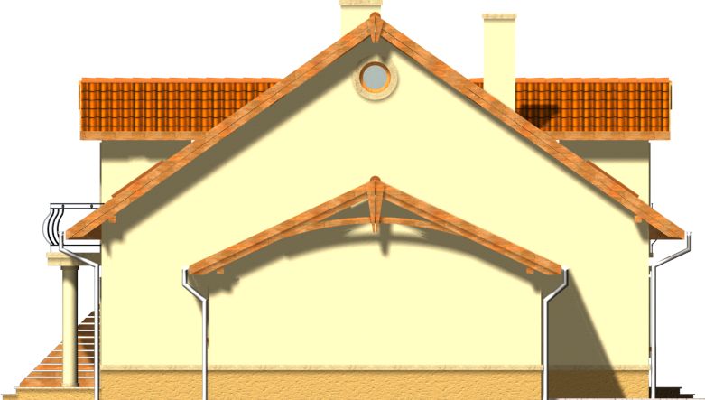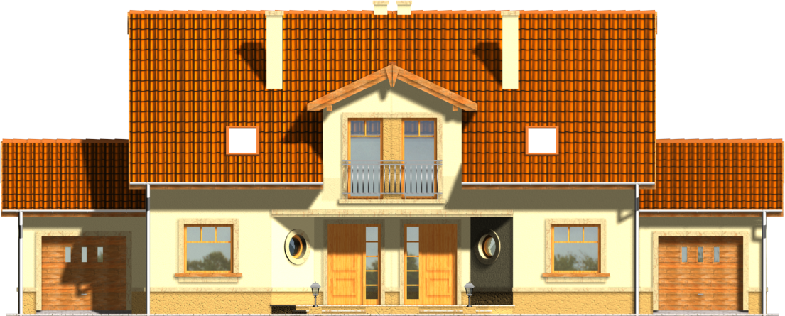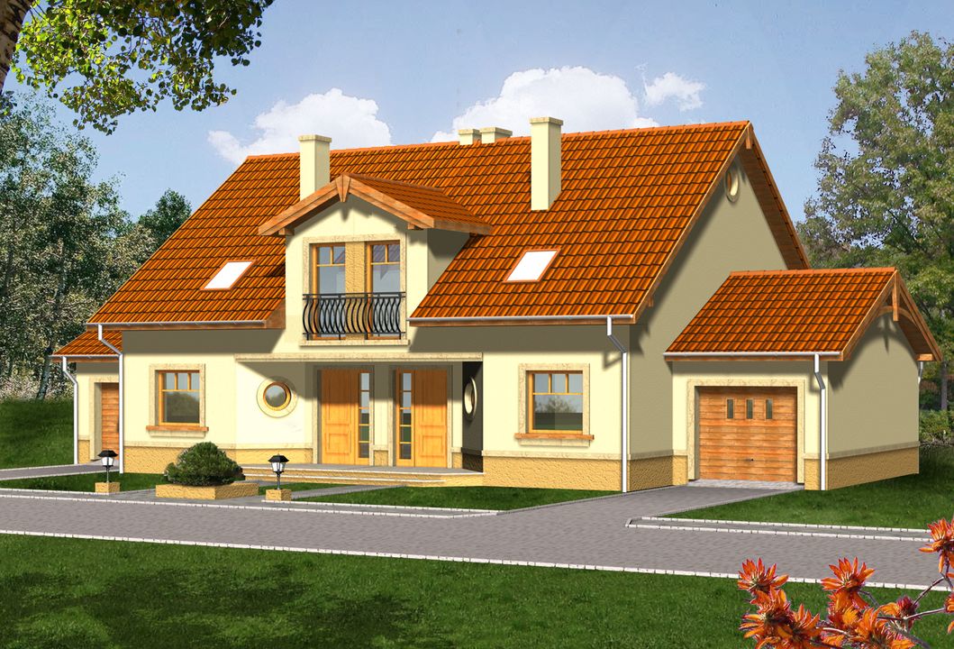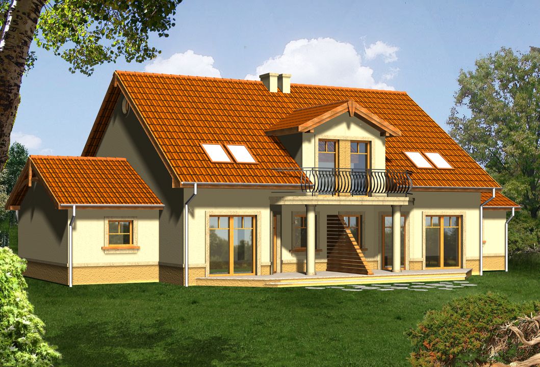 Graficzne opracowanie rzutów poglądowych widocznych na karcie projektu zostało wykonane przez Extradom.pl. Prezentowane przez Extradom.pl wizualizacje wykonane zostały przez autora projektu i należy poczytywać je jedynie za przykład i propozycję wykończenia, wizję architektoniczną autora projektu. Ostateczne wykończenie budynku może nastąpić na wiele sposobów. Szczegółowe rozwiązania zastosowane w oferowanej dokumentacji - w tym również ilość, lokalizacje i wygląd okien, drzwi, kominów - mogą w niewielkim stopniu różnić się od prezentowanej wizualizacji budynku.