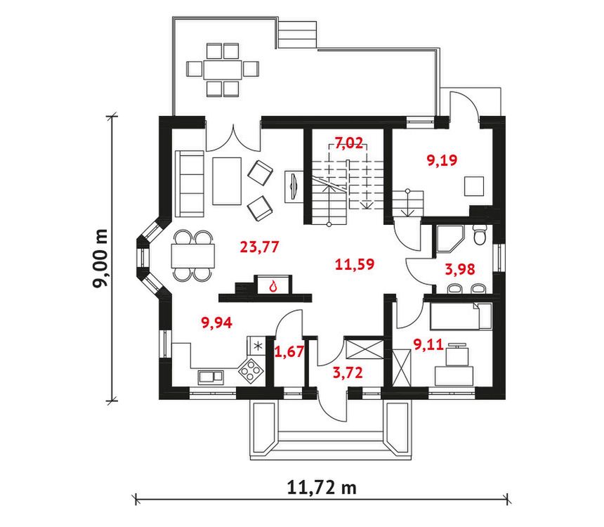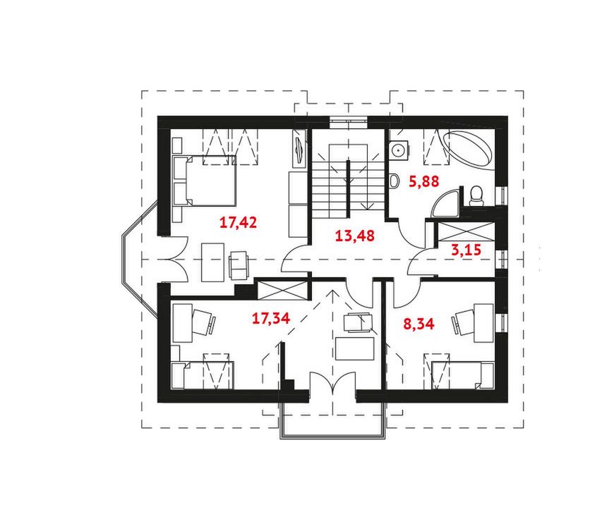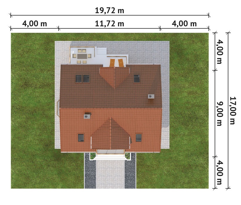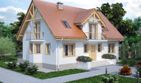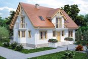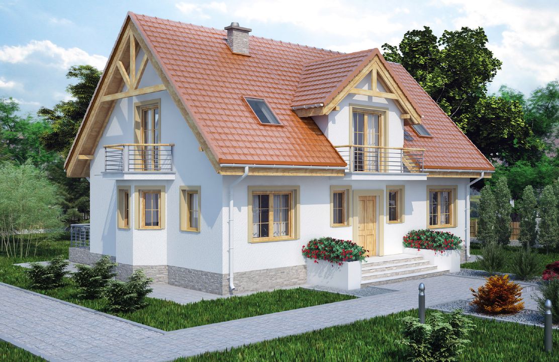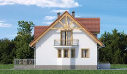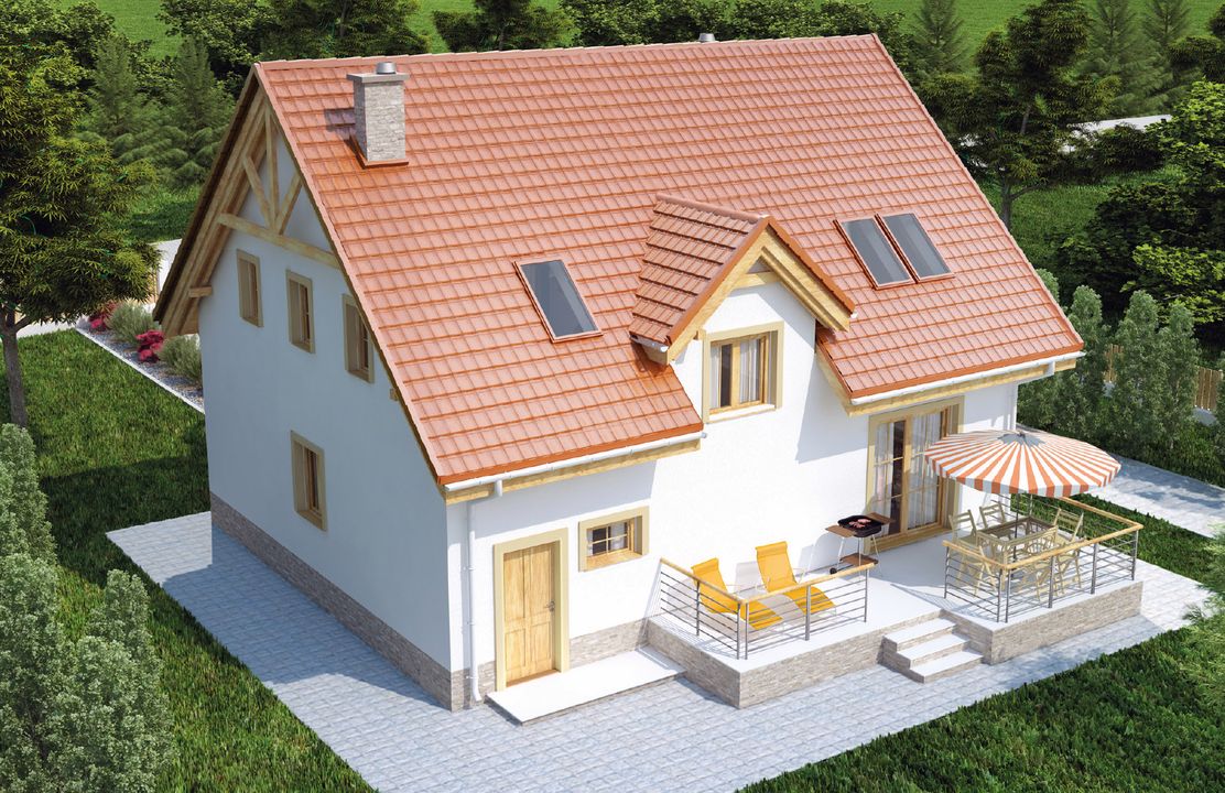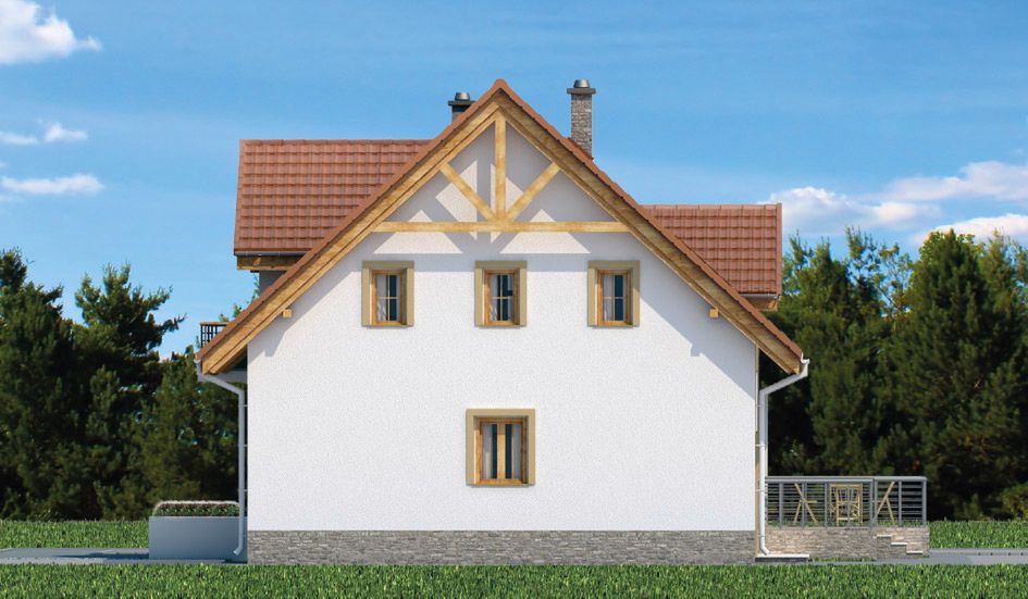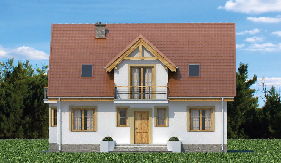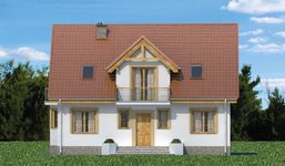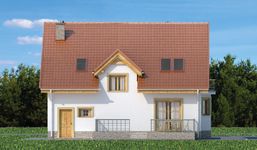 Graficzne opracowanie rzutów poglądowych widocznych na karcie projektu zostało wykonane przez Extradom.pl. Prezentowane przez Extradom.pl wizualizacje wykonane zostały przez autora projektu i należy poczytywać je jedynie za przykład i propozycję wykończenia, wizję architektoniczną autora projektu. Ostateczne wykończenie budynku może nastąpić na wiele sposobów. Szczegółowe rozwiązania zastosowane w oferowanej dokumentacji - w tym również ilość, lokalizacje i wygląd okien, drzwi, kominów - mogą w niewielkim stopniu różnić się od prezentowanej wizualizacji budynku.