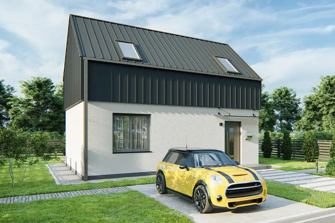 Graficzne opracowanie rzutów poglądowych widocznych na karcie projektu zostało wykonane przez Extradom.pl. Prezentowane przez Extradom.pl wizualizacje wykonane zostały przez autora projektu i należy poczytywać je jedynie za przykład i propozycję wykończenia, wizję architektoniczną autora projektu. Ostateczne wykończenie budynku może nastąpić na wiele sposobów. Szczegółowe rozwiązania zastosowane w oferowanej dokumentacji - w tym również ilość, lokalizacje i wygląd okien, drzwi, kominów - mogą w niewielkim stopniu różnić się od prezentowanej wizualizacji budynku.