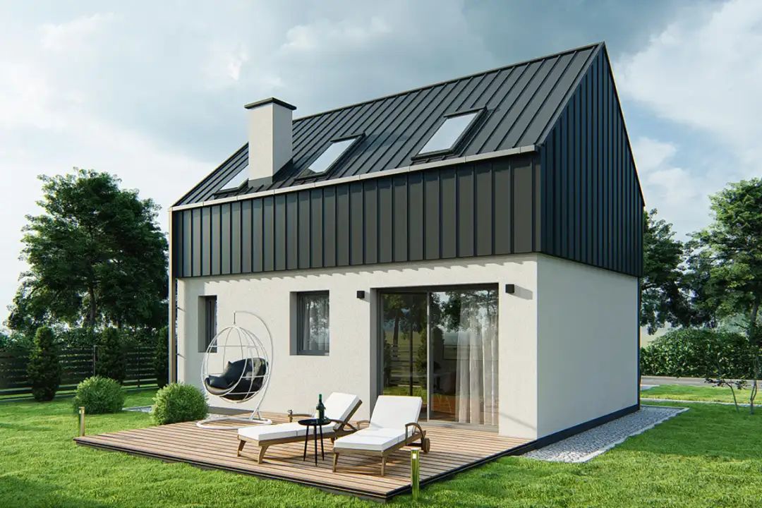 Strop: Rektor. Ściany zewnętrzne: silikat. Pokrycie dachowe: blacha na rąbek. Okna połaciowe: Fakro. Fundamentowanie: Ławy fundamentowe.