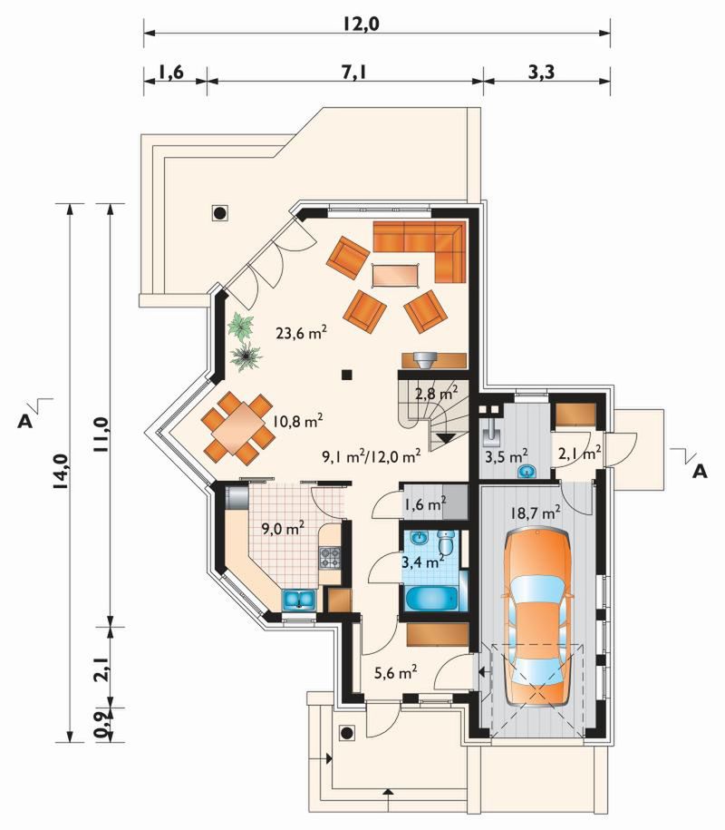 Technologia i konstrukcja: murowana – ceramika. Ściany zewnętrzne: pustaki ceramiczne typu U lub cegła kratówka + styropian lub wełna mineralna. Ściany wewnętrzne: cegła kratówka. Strop: żelbetowy. Konstrukcja dachu: drewniana, jętkowa. Rodzaj schodów: żelbetowe. Typ ogrzewania: kocioł na gaz. Aneks na paliwo stałe: na zamówienie. Pokrycie dachu: dachówka cementowa. Elewacja: tynk cienkowarstwowy, cokół z cegły elewacyjnej.