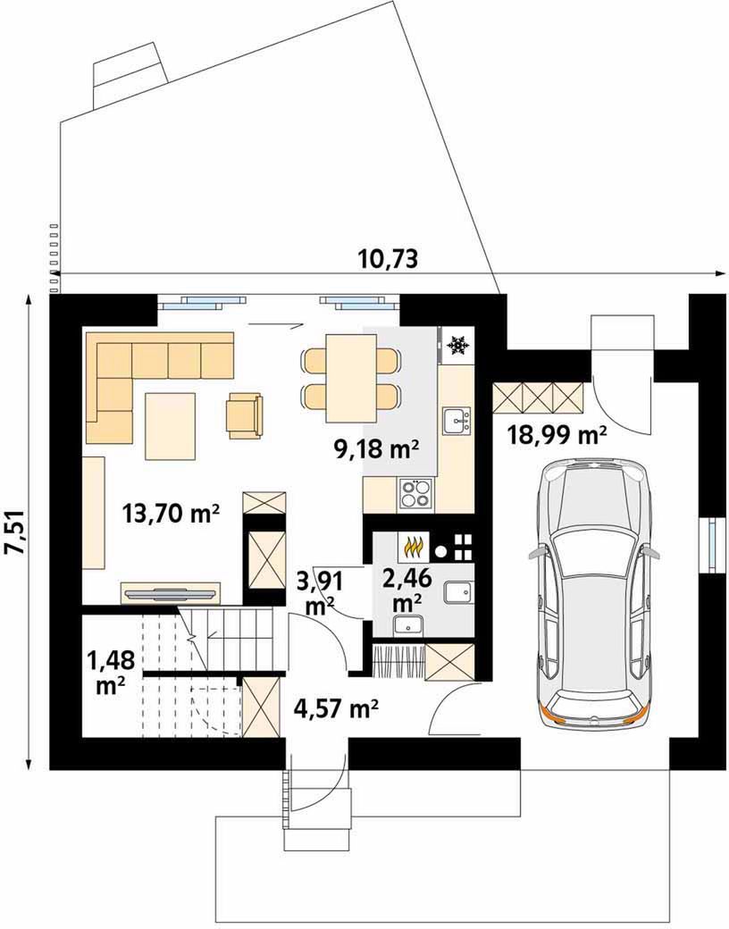 Graficzne opracowanie rzutów poglądowych widocznych na karcie projektu zostało wykonane przez Extradom.pl. Prezentowane przez Extradom.pl wizualizacje wykonane zostały przez autora projektu i należy poczytywać je jedynie za przykład i propozycję wykończenia, wizję architektoniczną autora projektu. Ostateczne wykończenie budynku może nastąpić na wiele sposobów. Szczegółowe rozwiązania zastosowane w oferowanej dokumentacji - w tym również ilość, lokalizacje i wygląd okien, drzwi, kominów - mogą w niewielkim stopniu różnić się od prezentowanej wizualizacji budynku.