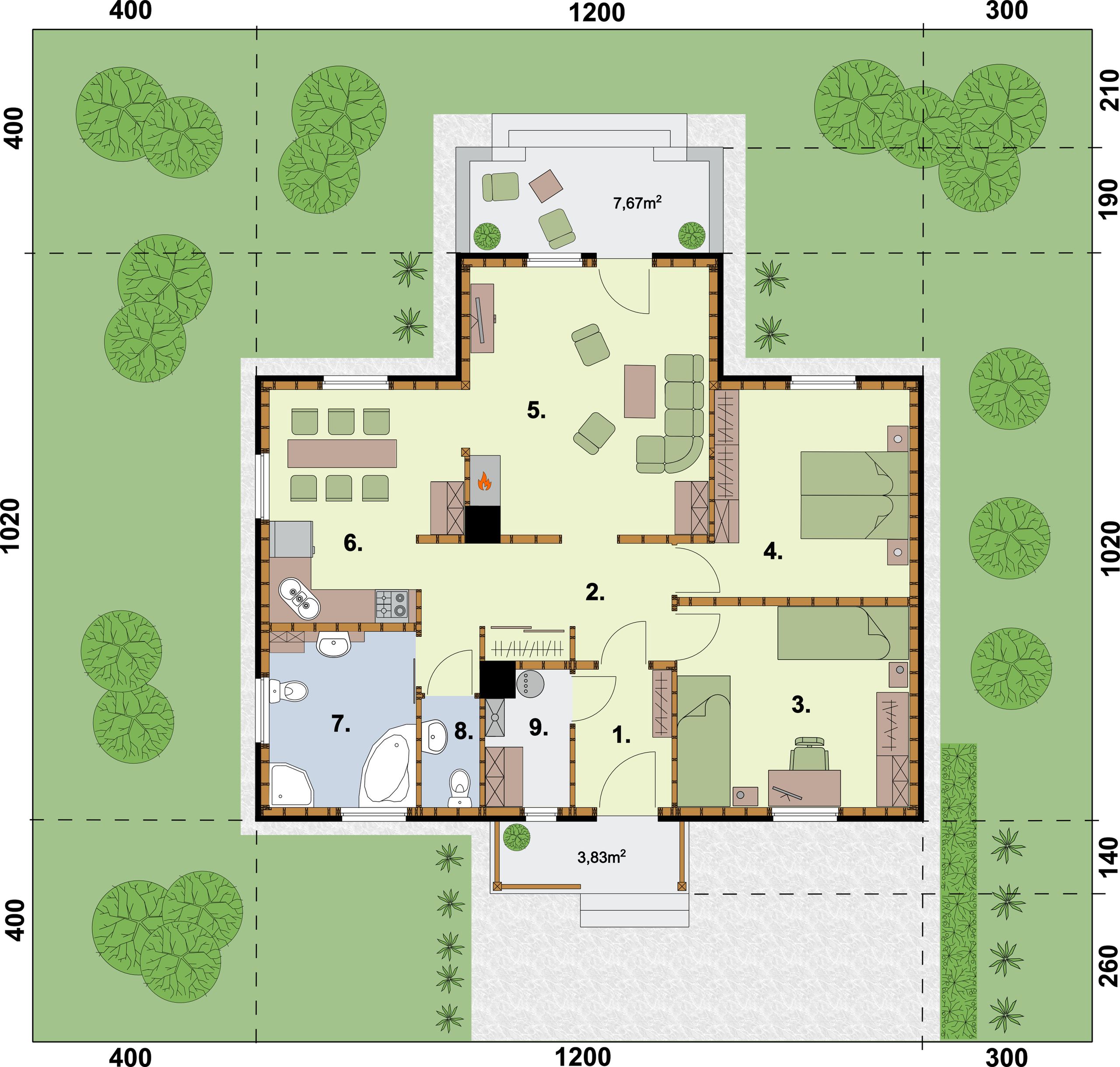 Graficzne opracowanie rzutów poglądowych widocznych na karcie projektu zostało wykonane przez Extradom.pl. Prezentowane przez Extradom.pl wizualizacje wykonane zostały przez autora projektu i należy poczytywać je jedynie za przykład i propozycję wykończenia, wizję architektoniczną autora projektu. Ostateczne wykończenie budynku może nastąpić na wiele sposobów. Szczegółowe rozwiązania zastosowane w oferowanej dokumentacji - w tym również ilość, lokalizacje i wygląd okien, drzwi, kominów - mogą w niewielkim stopniu różnić się od prezentowanej wizualizacji budynku.