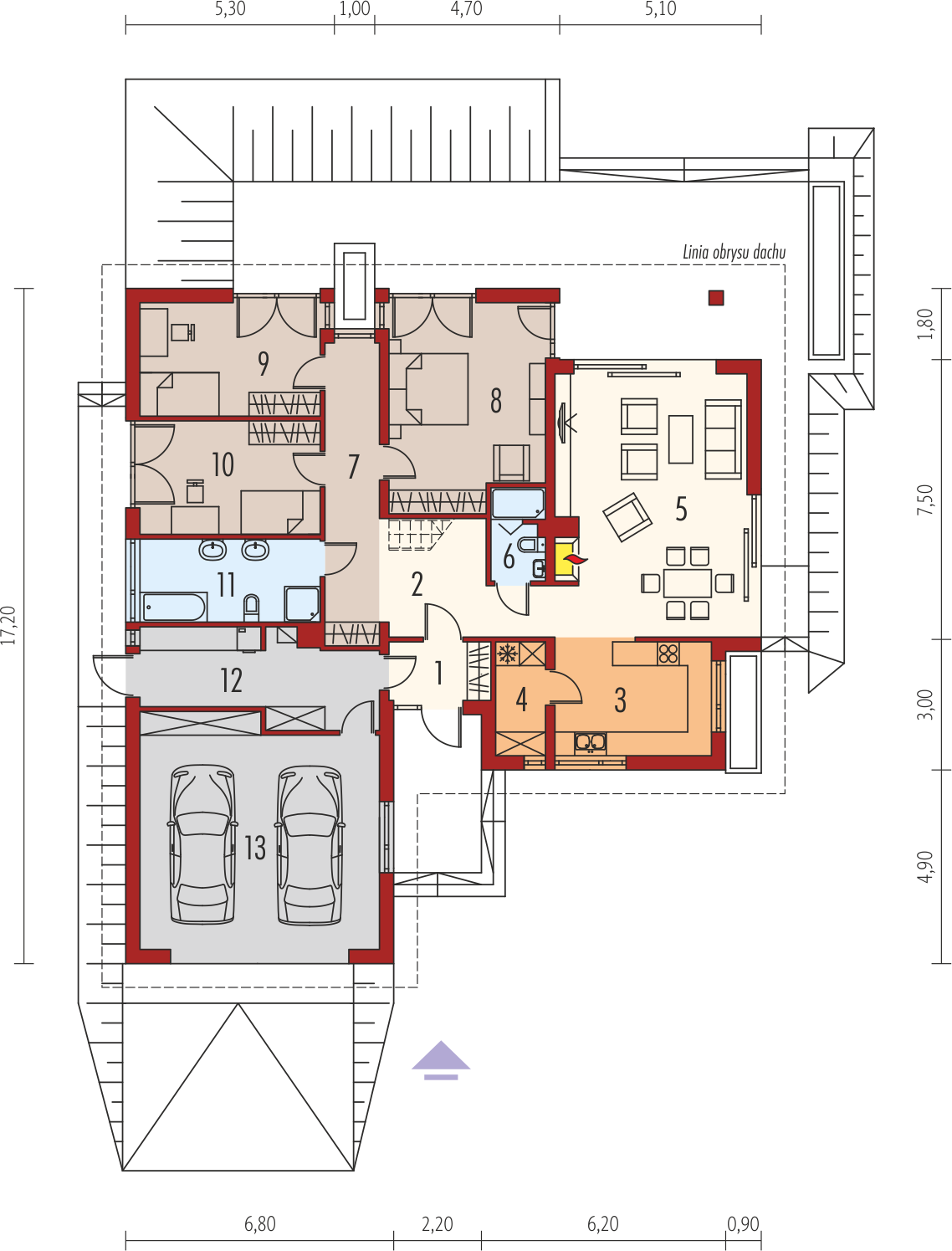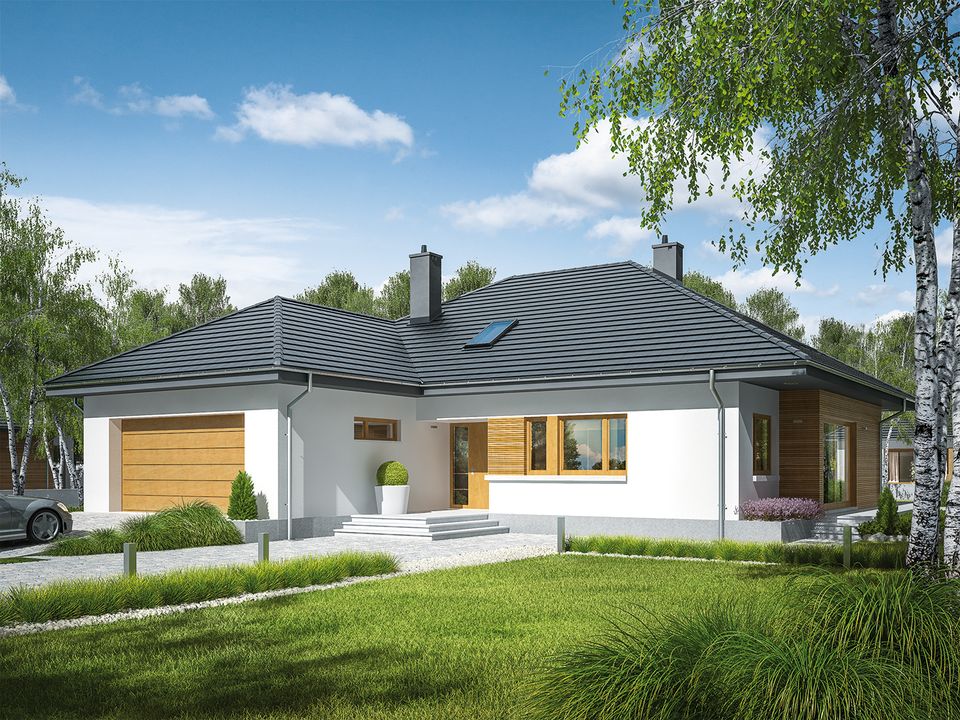 Graficzne opracowanie rzutów poglądowych widocznych na karcie projektu zostało wykonane przez Extradom.pl. Prezentowane przez Extradom.pl wizualizacje wykonane zostały przez autora projektu i należy poczytywać je jedynie za przykład i propozycję wykończenia, wizję architektoniczną autora projektu. Ostateczne wykończenie budynku może nastąpić na wiele sposobów. Szczegółowe rozwiązania zastosowane w oferowanej dokumentacji - w tym również ilość, lokalizacje i wygląd okien, drzwi, kominów - mogą w niewielkim stopniu różnić się od prezentowanej wizualizacji budynku.