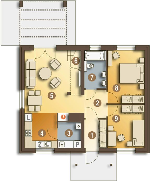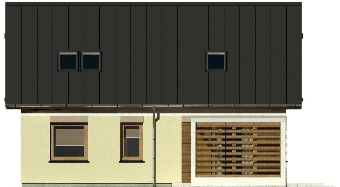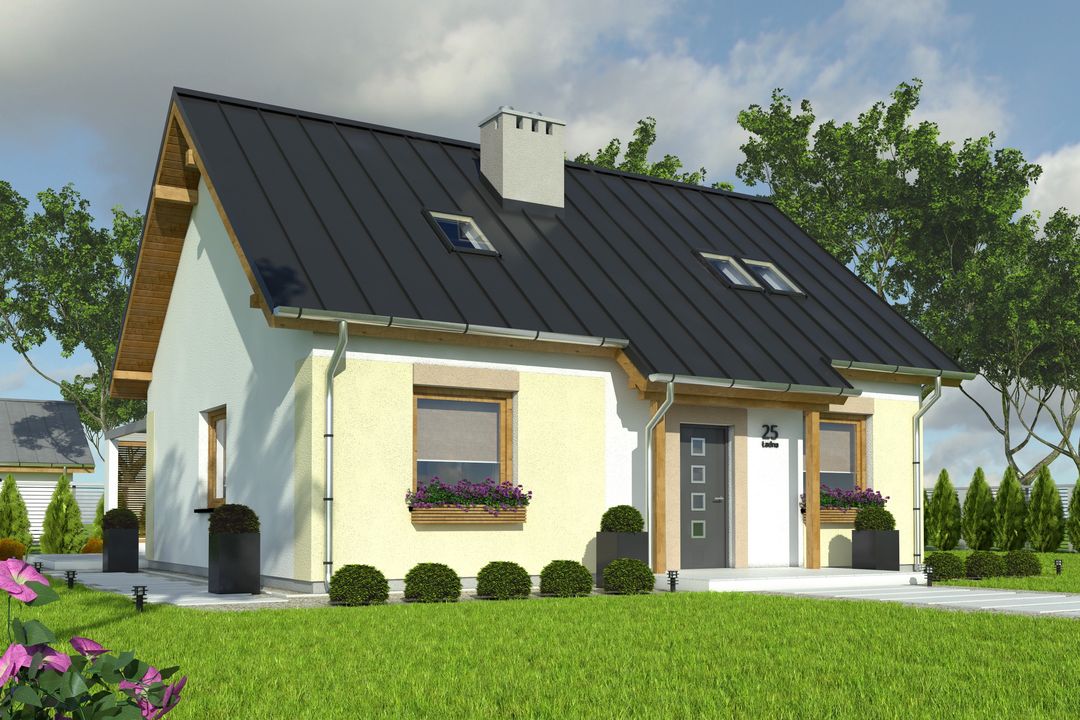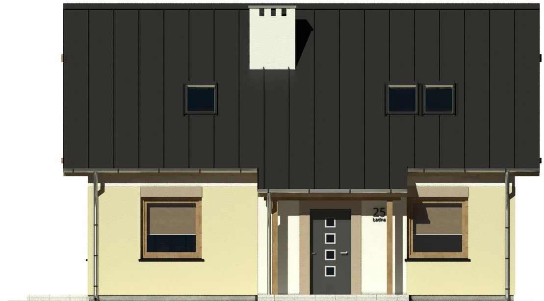 Graficzne opracowanie rzutów poglądowych widocznych na karcie projektu zostało wykonane przez Extradom.pl. Prezentowane przez Extradom.pl wizualizacje wykonane zostały przez autora projektu i należy poczytywać je jedynie za przykład i propozycję wykończenia, wizję architektoniczną autora projektu. Ostateczne wykończenie budynku może nastąpić na wiele sposobów. Szczegółowe rozwiązania zastosowane w oferowanej dokumentacji - w tym również ilość, lokalizacje i wygląd okien, drzwi, kominów - mogą w niewielkim stopniu różnić się od prezentowanej wizualizacji budynku.