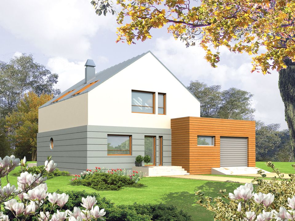 Graficzne opracowanie rzutów poglądowych widocznych na karcie projektu zostało wykonane przez Extradom.pl. Prezentowane przez Extradom.pl wizualizacje wykonane zostały przez autora projektu i należy poczytywać je jedynie za przykład i propozycję wykończenia, wizję architektoniczną autora projektu. Ostateczne wykończenie budynku może nastąpić na wiele sposobów. Szczegółowe rozwiązania zastosowane w oferowanej dokumentacji - w tym również ilość, lokalizacje i wygląd okien, drzwi, kominów - mogą w niewielkim stopniu różnić się od prezentowanej wizualizacji budynku.