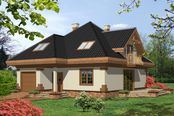 Graficzne opracowanie rzutów poglądowych widocznych na karcie projektu zostało wykonane przez Extradom.pl. Prezentowane przez Extradom.pl wizualizacje wykonane zostały przez autora projektu i należy poczytywać je jedynie za przykład i propozycję wykończenia, wizję architektoniczną autora projektu. Ostateczne wykończenie budynku może nastąpić na wiele sposobów. Szczegółowe rozwiązania zastosowane w oferowanej dokumentacji - w tym również ilość, lokalizacje i wygląd okien, drzwi, kominów - mogą w niewielkim stopniu różnić się od prezentowanej wizualizacji budynku.