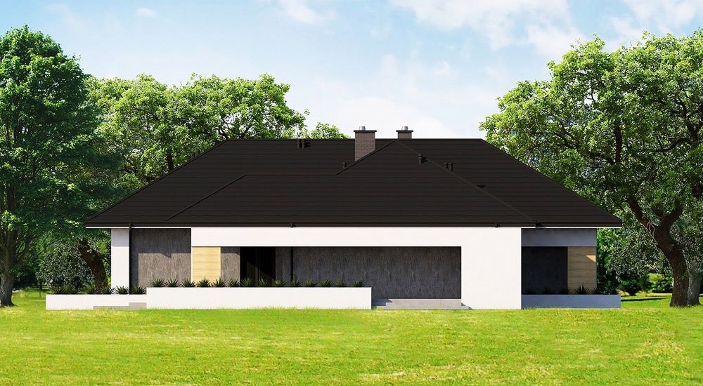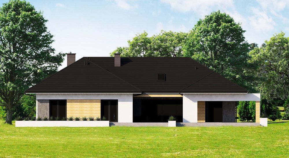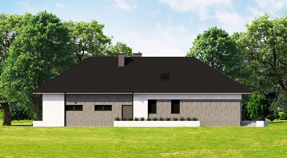 Graficzne opracowanie rzutów poglądowych widocznych na karcie projektu zostało wykonane przez Extradom.pl. Prezentowane przez Extradom.pl wizualizacje wykonane zostały przez autora projektu i należy poczytywać je jedynie za przykład i propozycję wykończenia, wizję architektoniczną autora projektu. Ostateczne wykończenie budynku może nastąpić na wiele sposobów. Szczegółowe rozwiązania zastosowane w oferowanej dokumentacji - w tym również ilość, lokalizacje i wygląd okien, drzwi, kominów - mogą w niewielkim stopniu różnić się od prezentowanej wizualizacji budynku.