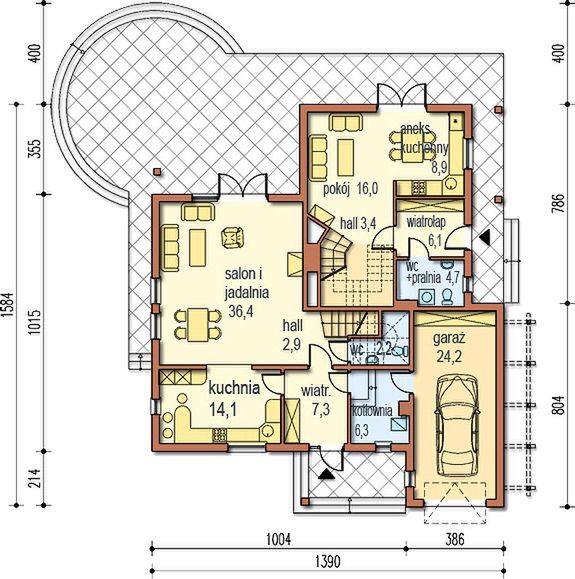 Graficzne opracowanie rzutów poglądowych widocznych na karcie projektu zostało wykonane przez Extradom.pl. Prezentowane przez Extradom.pl wizualizacje wykonane zostały przez autora projektu i należy poczytywać je jedynie za przykład i propozycję wykończenia, wizję architektoniczną autora projektu. Ostateczne wykończenie budynku może nastąpić na wiele sposobów. Szczegółowe rozwiązania zastosowane w oferowanej dokumentacji - w tym również ilość, lokalizacje i wygląd okien, drzwi, kominów - mogą w niewielkim stopniu różnić się od prezentowanej wizualizacji budynku.