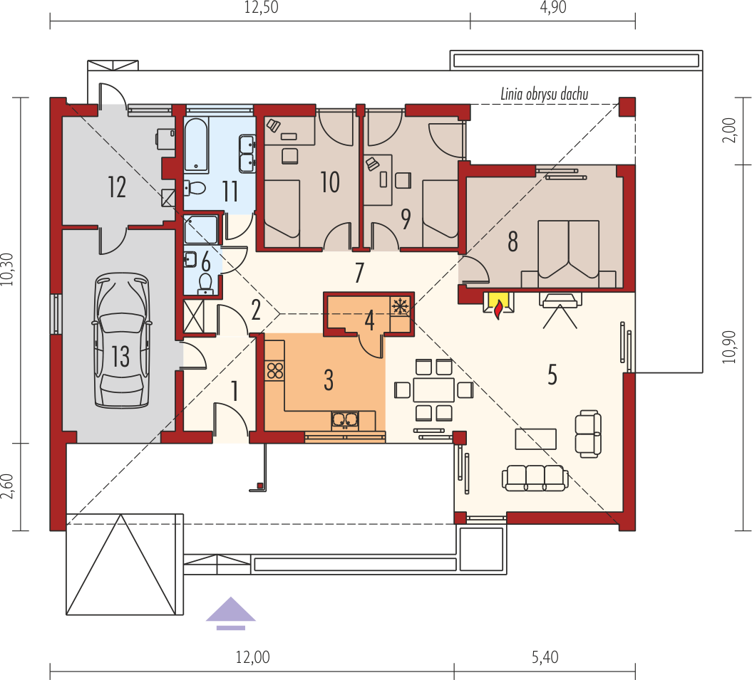 Graficzne opracowanie rzutów poglądowych widocznych na karcie projektu zostało wykonane przez Extradom.pl. Prezentowane przez Extradom.pl wizualizacje wykonane zostały przez autora projektu i należy poczytywać je jedynie za przykład i propozycję wykończenia, wizję architektoniczną autora projektu. Ostateczne wykończenie budynku może nastąpić na wiele sposobów. Szczegółowe rozwiązania zastosowane w oferowanej dokumentacji - w tym również ilość, lokalizacje i wygląd okien, drzwi, kominów - mogą w niewielkim stopniu różnić się od prezentowanej wizualizacji budynku.