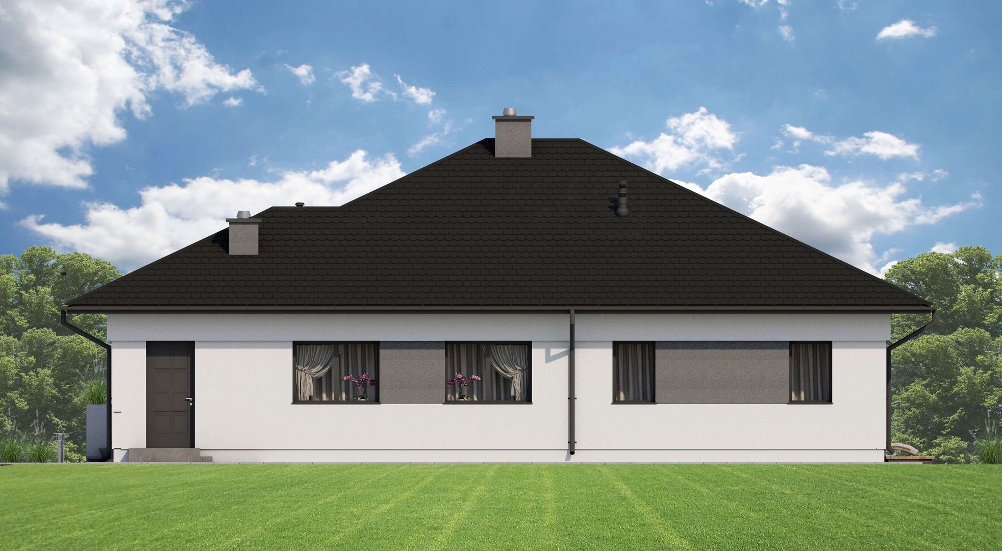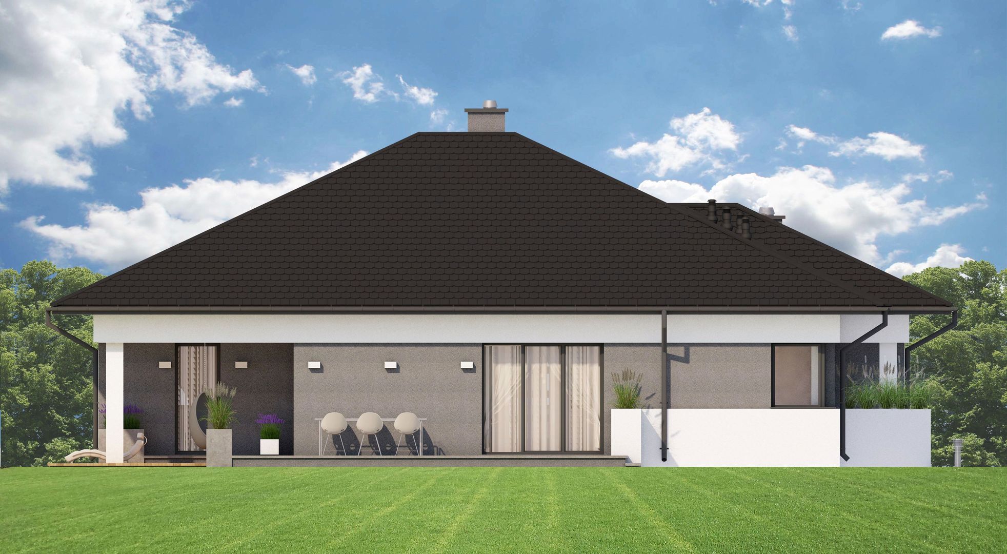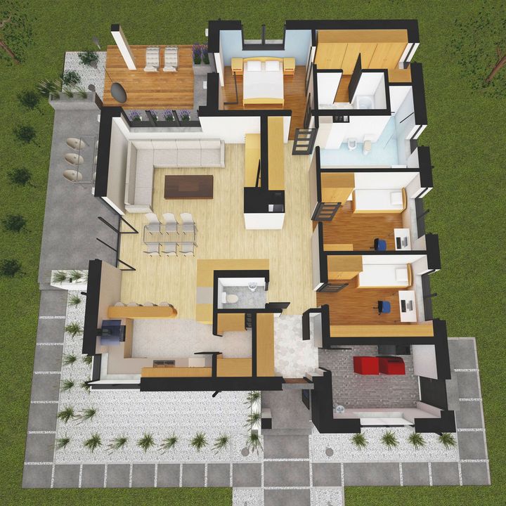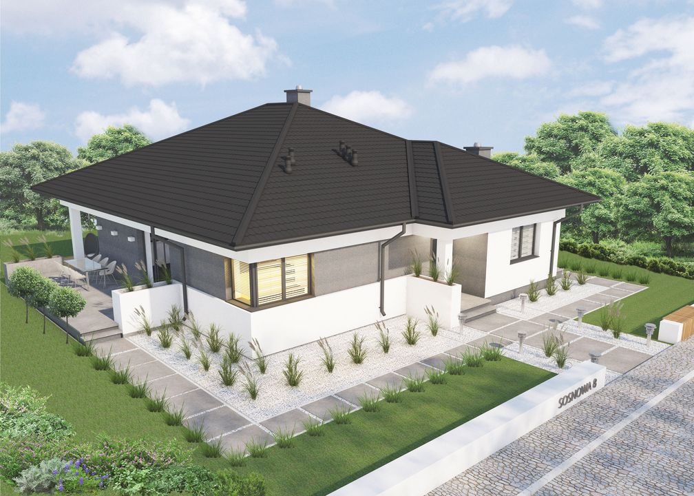 Graficzne opracowanie rzutów poglądowych widocznych na karcie projektu zostało wykonane przez Extradom.pl. Prezentowane przez Extradom.pl wizualizacje wykonane zostały przez autora projektu i należy poczytywać je jedynie za przykład i propozycję wykończenia, wizję architektoniczną autora projektu. Ostateczne wykończenie budynku może nastąpić na wiele sposobów. Szczegółowe rozwiązania zastosowane w oferowanej dokumentacji - w tym również ilość, lokalizacje i wygląd okien, drzwi, kominów - mogą w niewielkim stopniu różnić się od prezentowanej wizualizacji budynku.