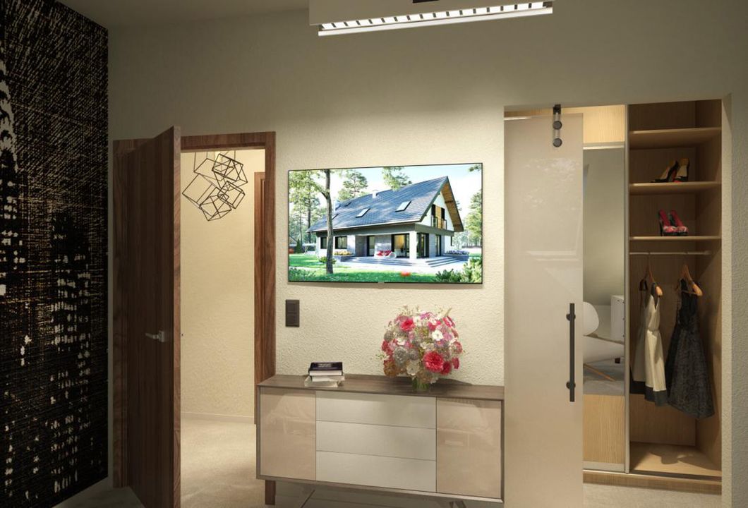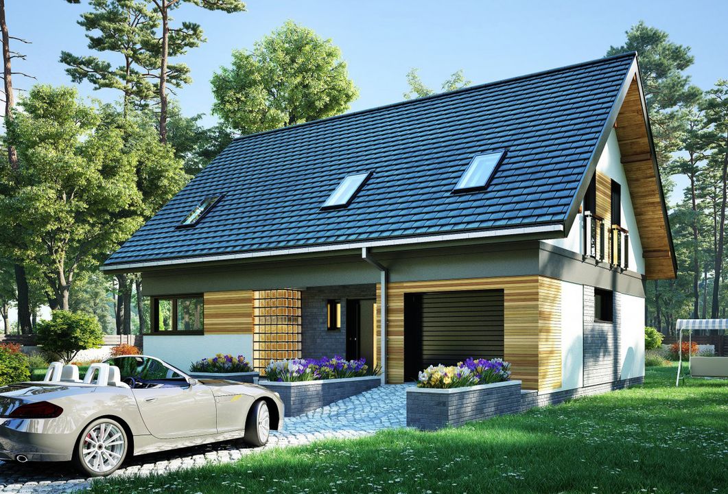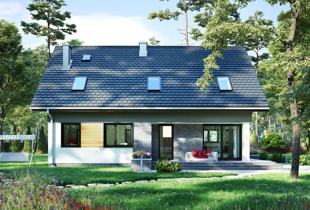 Graficzne opracowanie rzutów poglądowych widocznych na karcie projektu zostało wykonane przez Extradom.pl. Prezentowane przez Extradom.pl wizualizacje wykonane zostały przez autora projektu i należy poczytywać je jedynie za przykład i propozycję wykończenia, wizję architektoniczną autora projektu. Ostateczne wykończenie budynku może nastąpić na wiele sposobów. Szczegółowe rozwiązania zastosowane w oferowanej dokumentacji - w tym również ilość, lokalizacje i wygląd okien, drzwi, kominów - mogą w niewielkim stopniu różnić się od prezentowanej wizualizacji budynku.