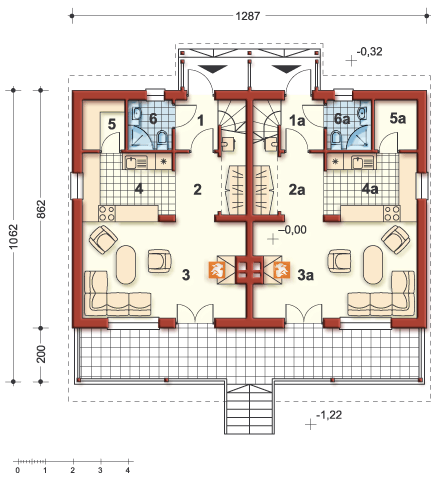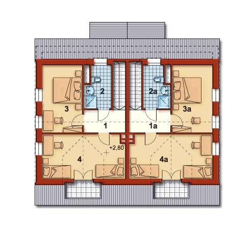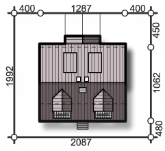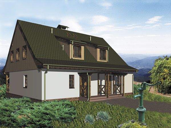 Graficzne opracowanie rzutów poglądowych widocznych na karcie projektu zostało wykonane przez Extradom.pl. Prezentowane przez Extradom.pl wizualizacje wykonane zostały przez autora projektu i należy poczytywać je jedynie za przykład i propozycję wykończenia, wizję architektoniczną autora projektu. Ostateczne wykończenie budynku może nastąpić na wiele sposobów. Szczegółowe rozwiązania zastosowane w oferowanej dokumentacji - w tym również ilość, lokalizacje i wygląd okien, drzwi, kominów - mogą w niewielkim stopniu różnić się od prezentowanej wizualizacji budynku.