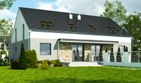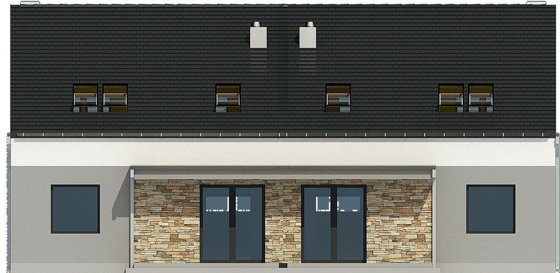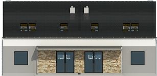 Graficzne opracowanie rzutów poglądowych widocznych na karcie projektu zostało wykonane przez Extradom.pl. Prezentowane przez Extradom.pl wizualizacje wykonane zostały przez autora projektu i należy poczytywać je jedynie za przykład i propozycję wykończenia, wizję architektoniczną autora projektu. Ostateczne wykończenie budynku może nastąpić na wiele sposobów. Szczegółowe rozwiązania zastosowane w oferowanej dokumentacji - w tym również ilość, lokalizacje i wygląd okien, drzwi, kominów - mogą w niewielkim stopniu różnić się od prezentowanej wizualizacji budynku.