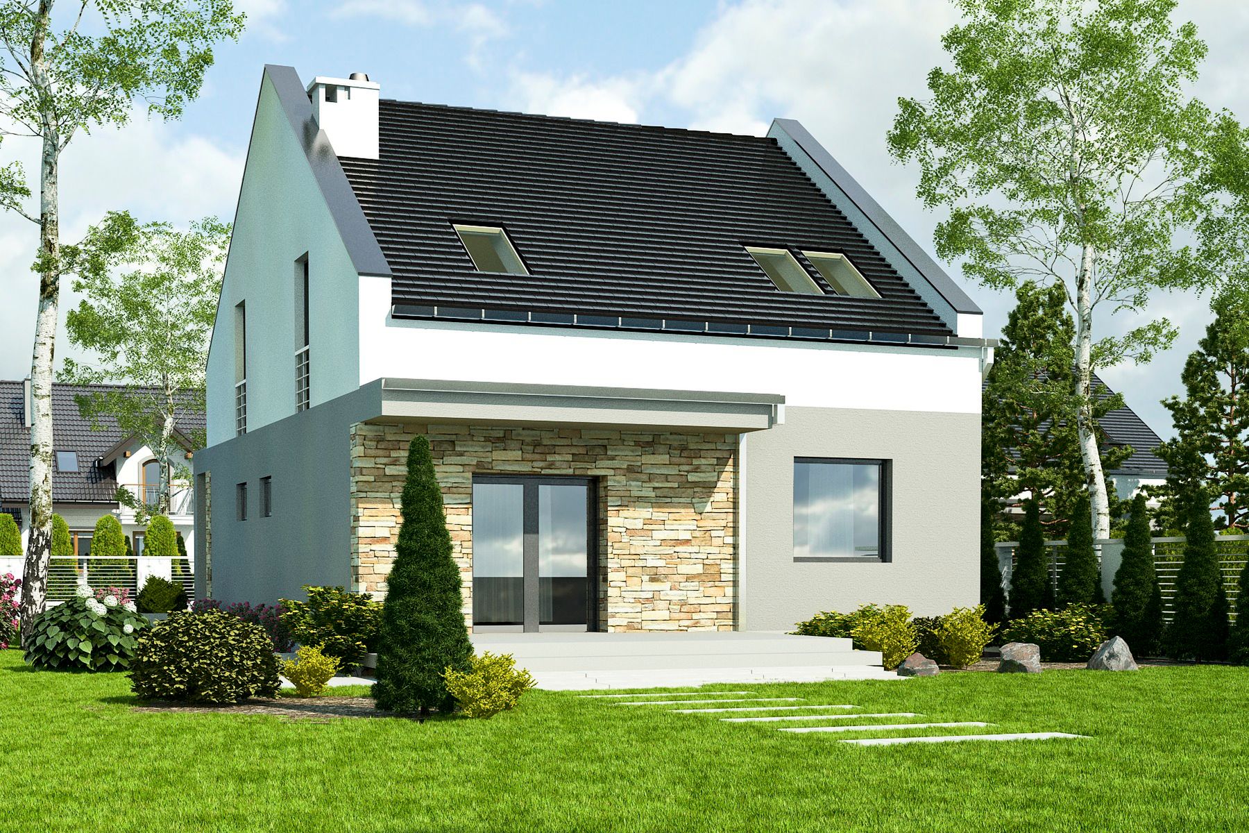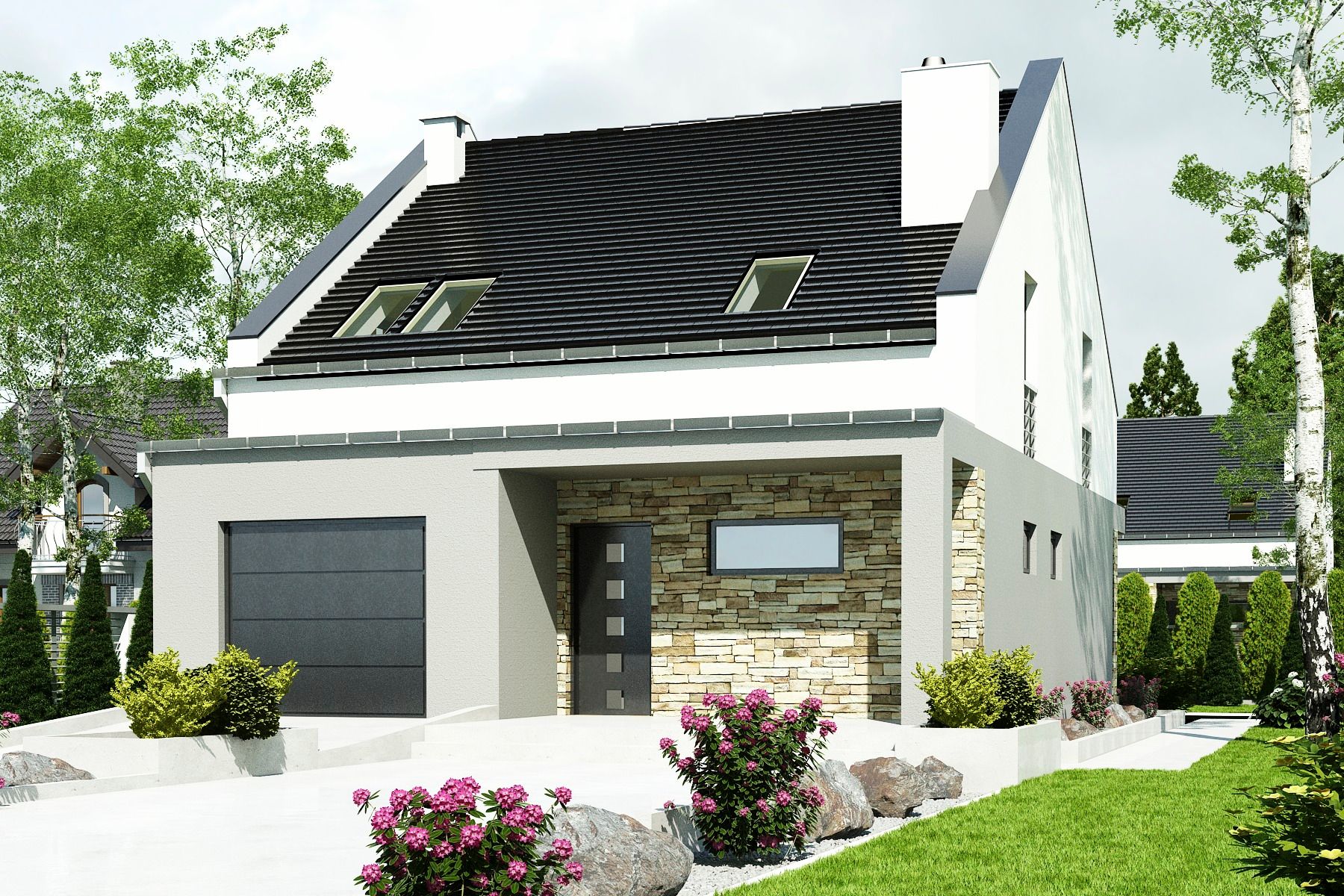 Projekt charakteryzuje się prostą, zwartą bryłą przykrytą dwuspadowym dachem, co jest sprawdzonym i ekonomicznym rozwiązaniem. Tradycyjny styl domu podkreśla jego ponadczasowy charakter. Jednostanowiskowy garaż został wysunięty do przodu, tworząc praktyczne zadaszenie nad strefą wejściową. Całość prezentuje się harmonijnie i z łatwością wkomponuje się w każde otoczenie.