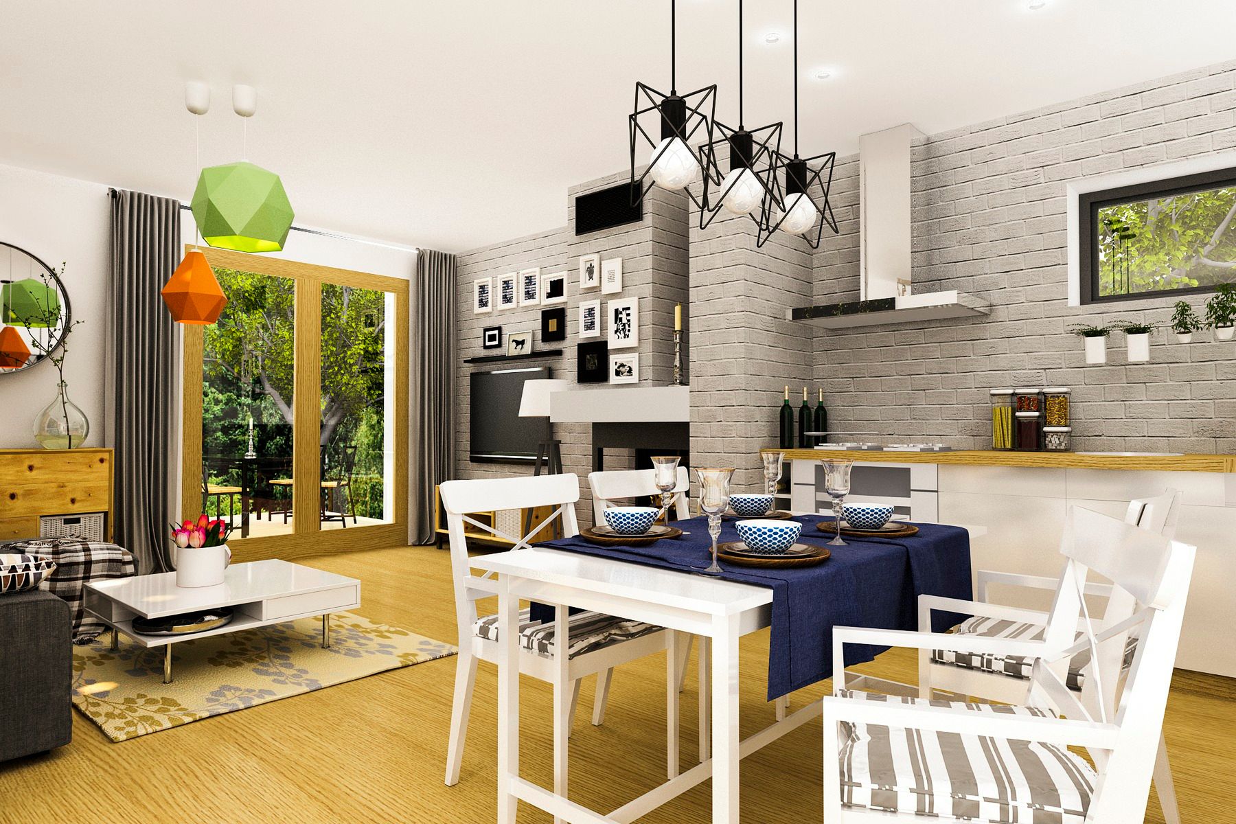 Centralnym punktem parteru jest otwarta strefa dzienna, w skład której wchodzi salon z miejscem na kominek oraz kuchnia z jadalnią. Z salonu prowadzi bezpośrednie wyjście na taras, co zachęca do spędzania czasu na świeżym powietrzu. Codzienną wygodę zapewnia spiżarnia zlokalizowana w pobliżu kuchni. Na tej kondygnacji znajduje się również dodatkowy pokój, który można zaaranżować jako gabinet lub sypialnię dla gości, a także ogólnodostępna łazienka. Programu dopełnia wiatrołap, pomieszczenie gospodarcze oraz garaż jednostanowiskowy, praktycznie skomunikowany z częścią mieszkalną.