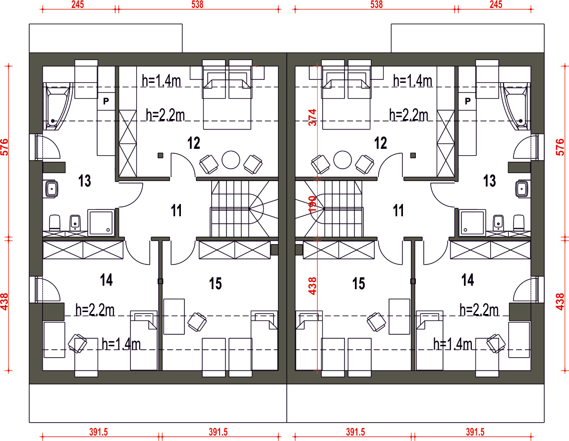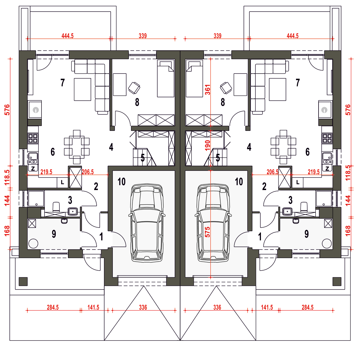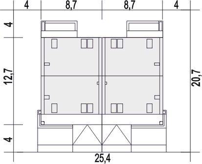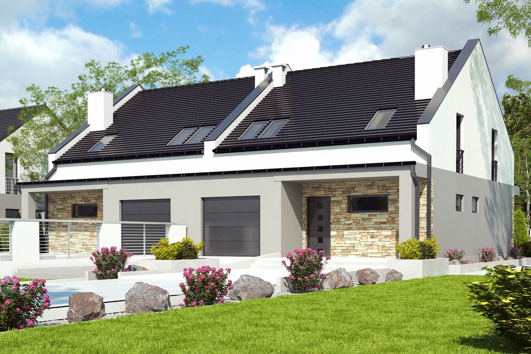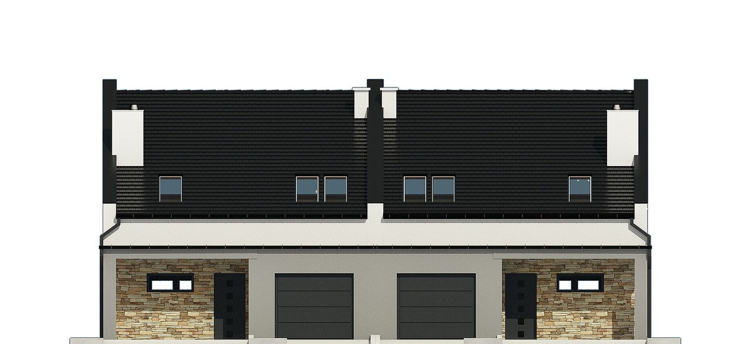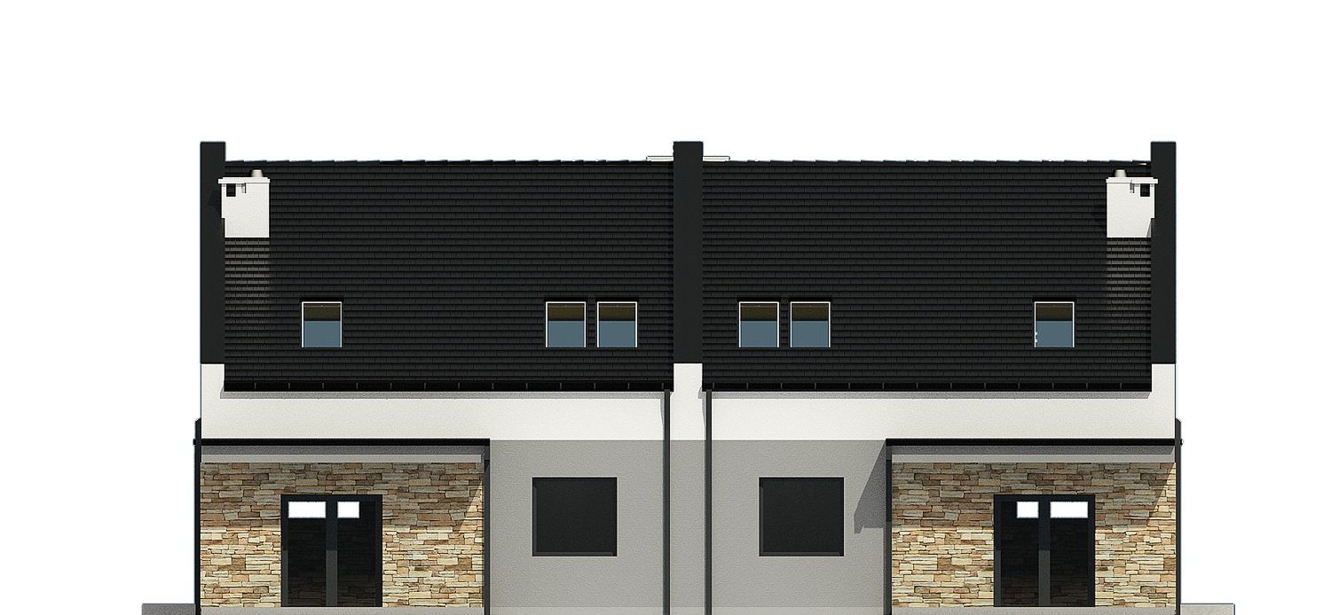Projekt wymaga aktualizacji. Przy zakupie projektu należy zapłacić 50% zaliczki. Zaliczka jest bezzwrotna w przypadku zwrotu lub rezygnacji z zamówienia. Budynek dwulokalowy posadowiony na wspólnym fundamencie. Jeśli planujesz budowę na osobnych działkach zamów pojedyncze segmenty: podstawa + lustro.