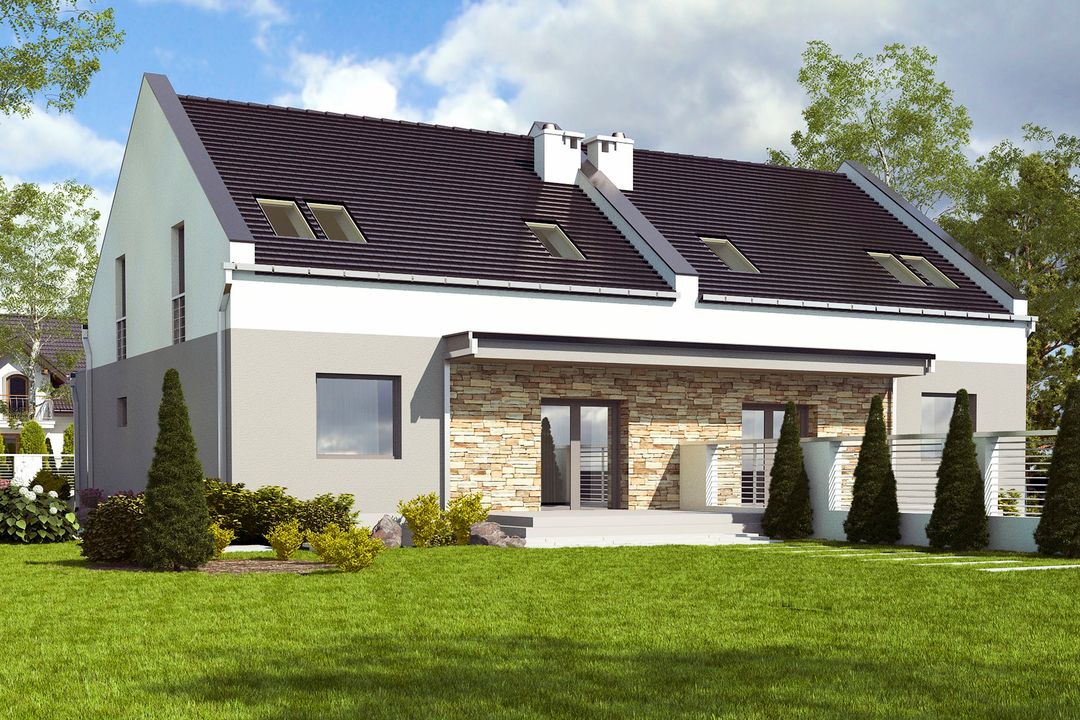 Graficzne opracowanie rzutów poglądowych widocznych na karcie projektu zostało wykonane przez Extradom.pl. Prezentowane przez Extradom.pl wizualizacje wykonane zostały przez autora projektu i należy poczytywać je jedynie za przykład i propozycję wykończenia, wizję architektoniczną autora projektu. Ostateczne wykończenie budynku może nastąpić na wiele sposobów. Szczegółowe rozwiązania zastosowane w oferowanej dokumentacji - w tym również ilość, lokalizacje i wygląd okien, drzwi, kominów - mogą w niewielkim stopniu różnić się od prezentowanej wizualizacji budynku.