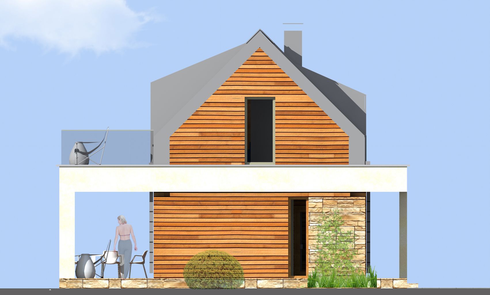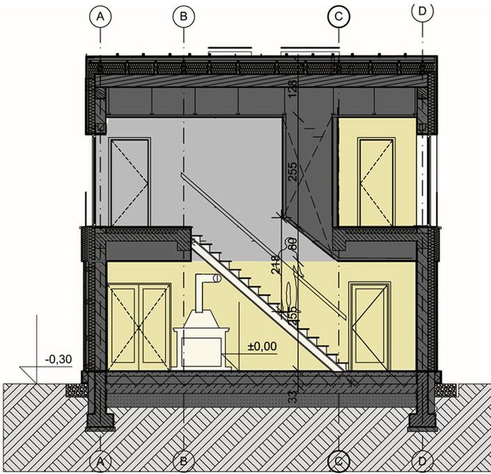 Fundamenty- żelbetowe. Ściany: bloczki porotherm 25cm + docieplenie 15cm + okładzina drewnianalub kamienna; strop – żelbetowy; pokrycie dachu – blacha dachowa.