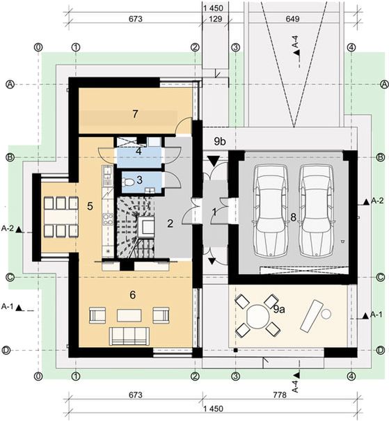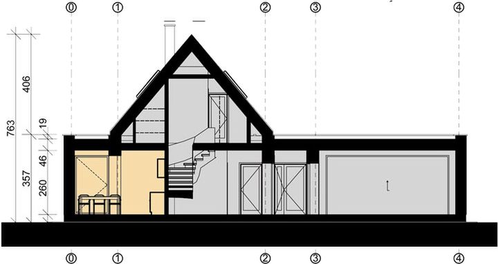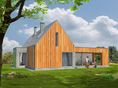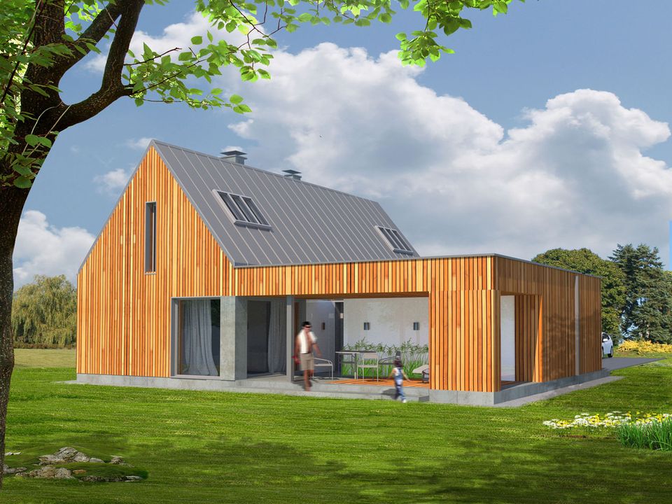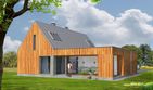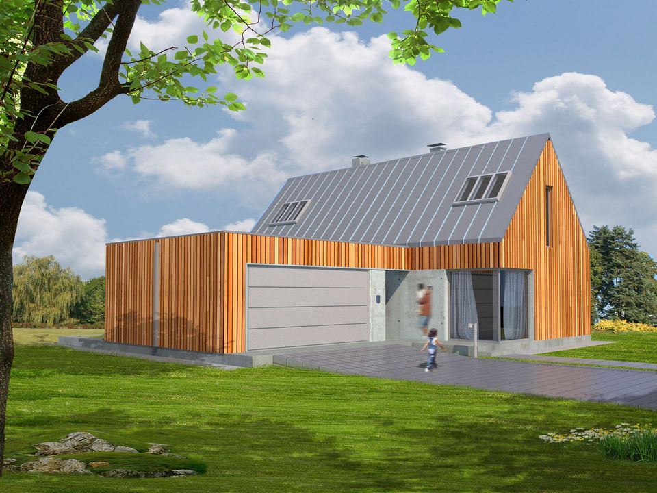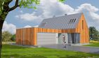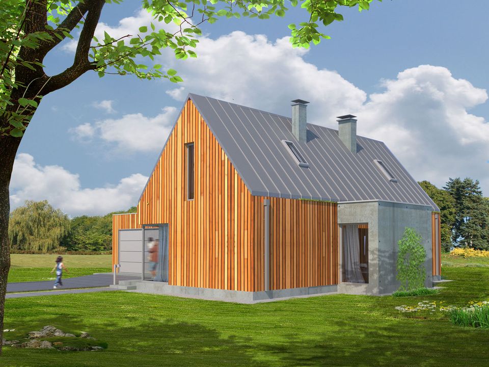 Fundamenty: żelbetowe. Ściany: dwuwarstwowe: bloczki ceramiczne 25 cm + docieplenie 15-18 cm. Strop: żelbetowy. Elewacja: z okładziny elewacyjnej z drewna syberyjskiego. Pokrycie dachu: blacha dachowa łączona na rąbek stojący. Ściany działowe: szkieletowe. Drzwi tarasowe oraz balkonowe o podwyższonej izolacyjności termicznej. UWAGA! Projekt w fazie koncepcyjnej, prosimy o kontakt w sprawie okresu oczekiwania na realizację zamówienia.