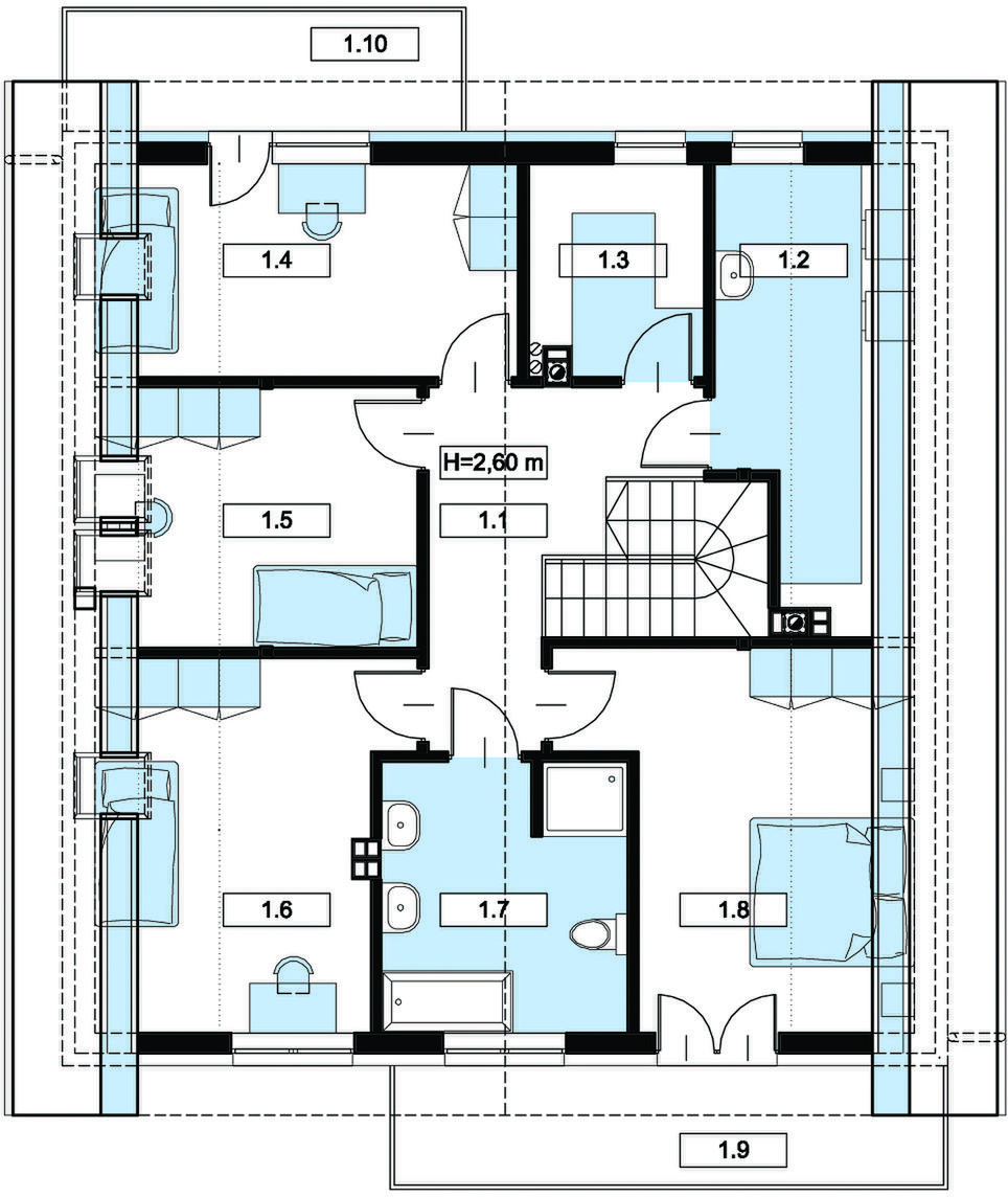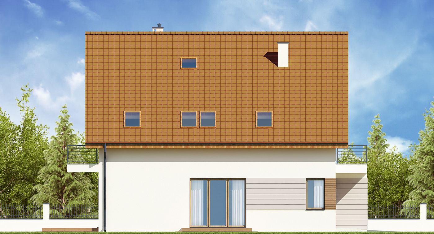 Graficzne opracowanie rzutów poglądowych widocznych na karcie projektu zostało wykonane przez Extradom.pl. Prezentowane przez Extradom.pl wizualizacje wykonane zostały przez autora projektu i należy poczytywać je jedynie za przykład i propozycję wykończenia, wizję architektoniczną autora projektu. Ostateczne wykończenie budynku może nastąpić na wiele sposobów. Szczegółowe rozwiązania zastosowane w oferowanej dokumentacji - w tym również ilość, lokalizacje i wygląd okien, drzwi, kominów - mogą w niewielkim stopniu różnić się od prezentowanej wizualizacji budynku.